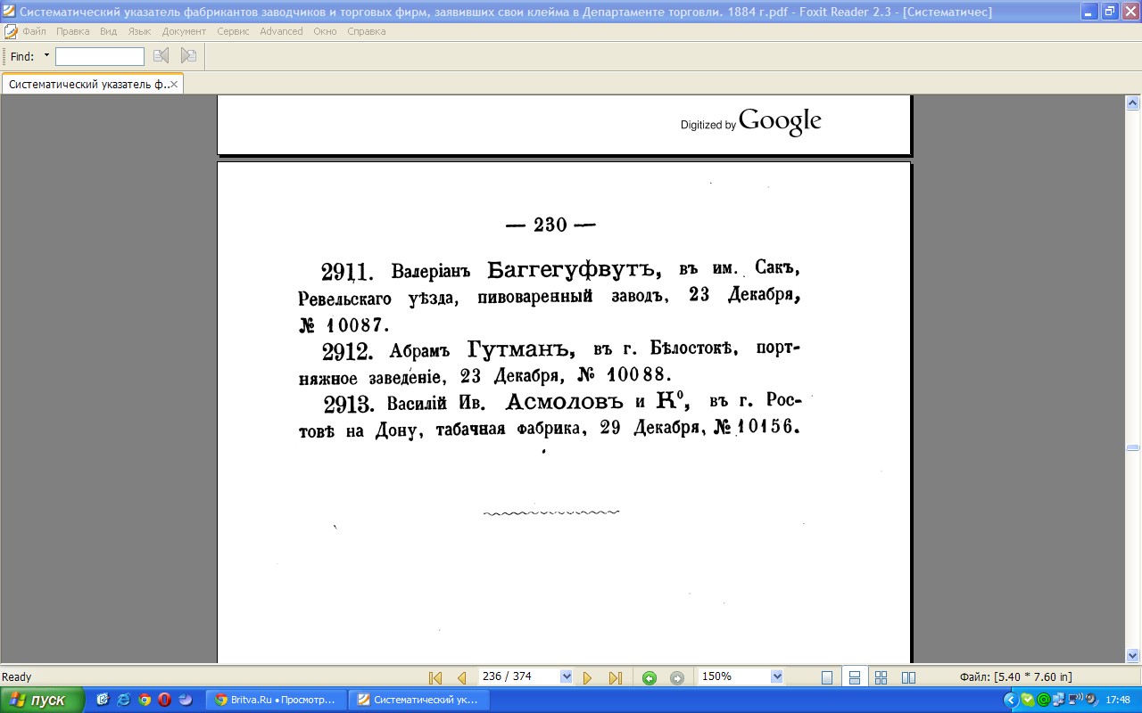 http://books.google.ee/books?id=f7oZAAA ... &q&f=false http://books.google.ee/books?id=1Ig4aVz ... 85&f=false http://books.google.ee/books?id=zUhC2xM ... BC&f=false Российский закон о товарном знаке был принят 25 февраля 1896 года и действовал до Октябрьской революции. В этом документе подробно оговаривалась процедура регистрации знаков, определялись сроки их действия и меры по защите товарных знаков. Для регистрации знака необходимо было подать заявку в Департамент промышленности, мануфактур и торговли. Свидетельство о регистрации выдавалось на срок от одного года до десяти лет. http://www.tovarnyeznaki.kz/ru/interes_6.php Систематическïй указатель фабрикантов, заводчиков и торговых фирм, заявивших свои клеǐма в Департаментѣ торговли и мануфактур http://books.google.ee/books?id=82FIAAA ... imilarbook Свод данных о фабрично-заводской промышленности в Россіи за ... год http://books.google.ee/books?id=pYUuAAA ... milarbooks http://books.google.ee/books/about/%D0% ... edir_esc=y см. Похожие книги, много интересного /attachment Подборка литературы по торговле в Царской России датирование бутылки со столь близким по номеру патентом Show