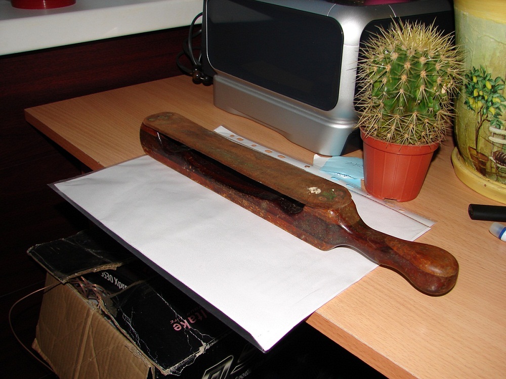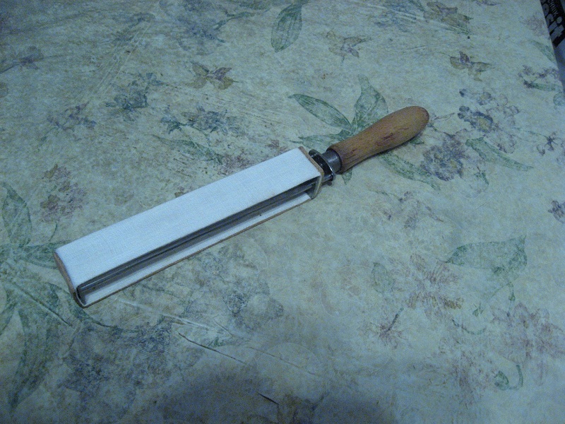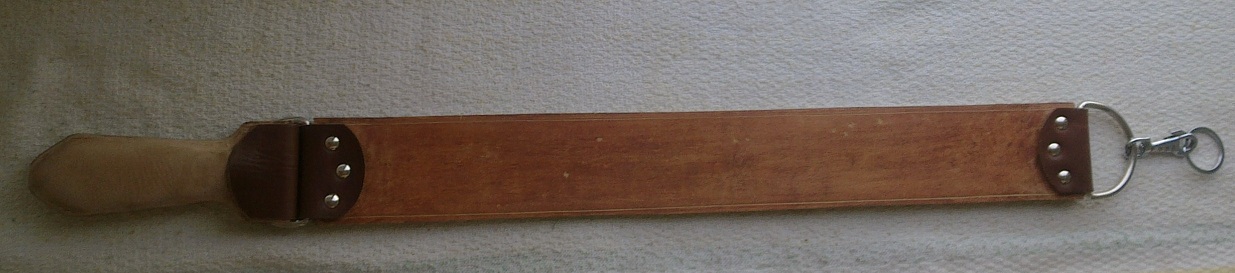 Re: Изготовление ремней для правкиВот отреставрировал старенький ремешок (кстати может кто подскажет что это? клейм нету...). Пришлось отдирать ручку капитально, да и кожу менять на новую.