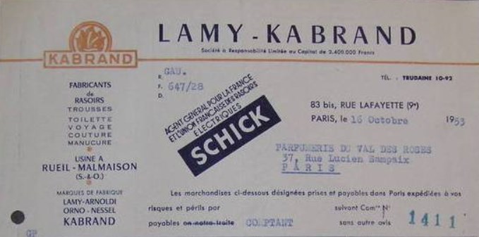 а на втором, 1953 года: trousses toilette voyage couture manucure наборы: туалетные, для путешествий, для шитья, маникюрные. На последней странице прейскуранта и на счете фактуры 1953 года видим: (я сделал коллаж) usine a Rueil-Malmaison, это: завод в городе Рюэй-Мальмезон, ныне пригород Парижа. В этом городе завод находился по адресу: 3, avenu Gabriel Peri. Из коммерческих справочников 60х годов профиль фабрики: fabrique de tous articles de tabletterie et de coutellerie, где tabletterie это производство мелких предметов роскоши из кости и ценных пород дерева, а coutellerie, соответственно, ножевое производство, столовые приборы. Директорами, в разное время были: вдова Suzanne HERICHE, Marie-Claire HERICHE, Albert HERICHE. Судя по такой преемственности, это и есть владельцы, семейство HERICHE. Последнее упоминание о фирме KABRAND, в коммерческом справочнике, было в 1991 году. Spoiler Show Фирма LAMY KABRAND, торговые марки: KABRAND, ARNOLDI, NESSEL, ORNO, LAMY