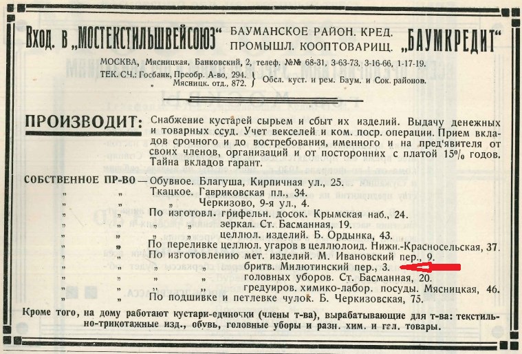 Гм... это кооптоварищество входило в Мостекстильшвейсоюз и, кроме банковской деятельности, имело свое производство. В частности, бритвы делали в Милютинском переулке, 3.