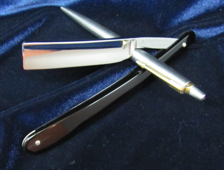 Параметры: ширина 16,5мм, обух 4,3мм. Ручка из кости, ровная, без потерь. Возраст- скорее всего довоенный выпуск на экспорт. Бритва прошла процесс реставрации и заточки лично мной, пины , геометрия, клеймо производителя были сохранены. Продано Oxford Razor Show