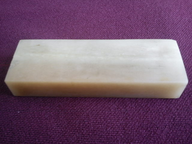 Раздобыл сегодня вот такой камень. Несколько прозрачен, в глубине имеются красноватые прожилки. Зернистость неизвестна. Размеры: 200*33*14 мм. Что это может быть за камень?