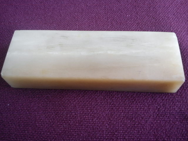 Это Hard Arkansas, причем современной выработки. Сильно отличается от такого же камня, только старого, лет 100. Старые камни значительно лучше. Как стартер очень неплох. Его советуют использовать с маслом, замечательно мягко точит. А современный мягкий Арканзас выглядит вот так.