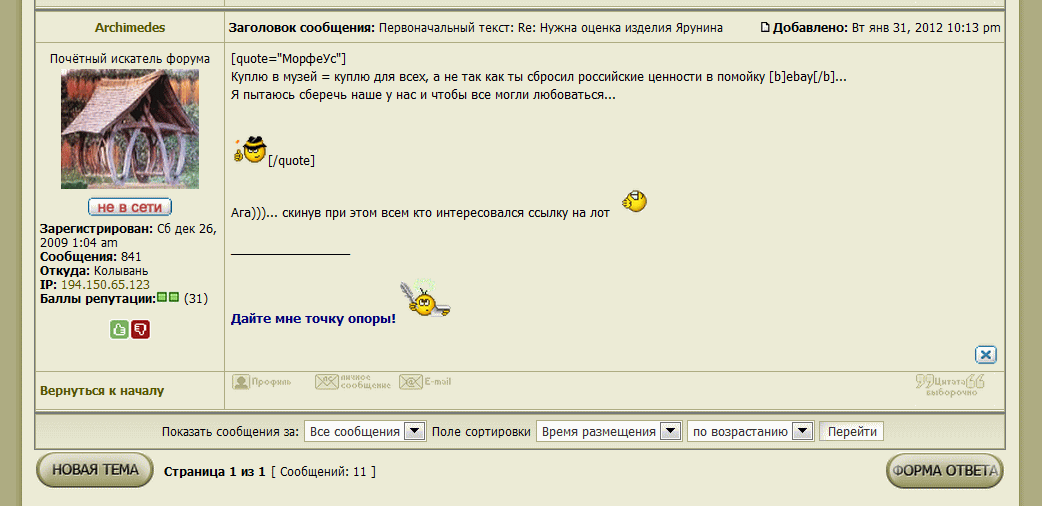 Re: Нужна оценка изделия ЯрунинаЯ готов был отдать 300 баксов только за одну ярунинскую что у вас в антикварном лежала в отличном сохране, но тебя жаба задушила помочь её купить...