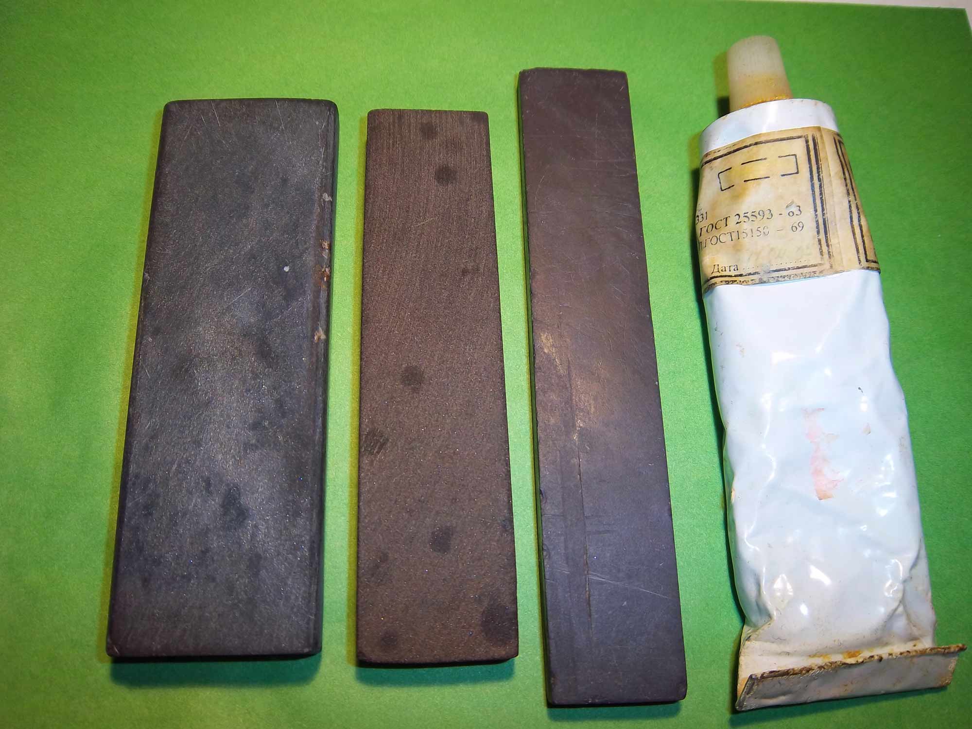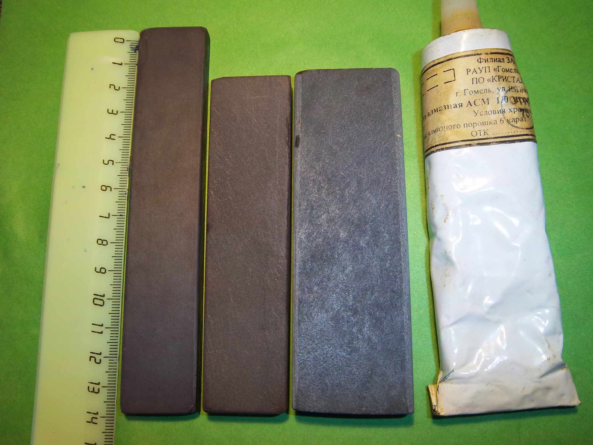 Три камня, один натуральный, два синтетика. Все камни старые. Самый длинный фиолетового цвета, средний на фото похож на прессованную резину с вкраплениями абразива. Черный камень натуральный, какой не знаю. Паста алмазная АСМ 1/0 НОМ размер зерна 1 микрон, тюбик открыт. Дополнительная информация, в личку.