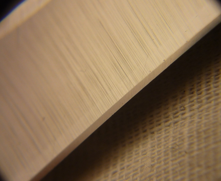 Этот скол образовался после коричневого советского камушка для правки бритв, гритности не знаю. В процессе точения пару раз почувствовал песчинки, видимо от камушка. Вот результат. Как бороться с выкрашиванием брусочка? Кстати на камне видна неоднородность состава. Думаю надо новый прикупить..