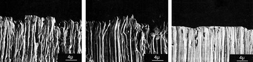 Но тот же хард (и, особенно, ещё более твёрдые) с водой и с маслом могут дать существенно разную картину. Слева на право: мягкий арканзасский камень с минеральным маслом, твёрдый арканзасский камень без масла, твёрдый арканзасский камень с маслом.