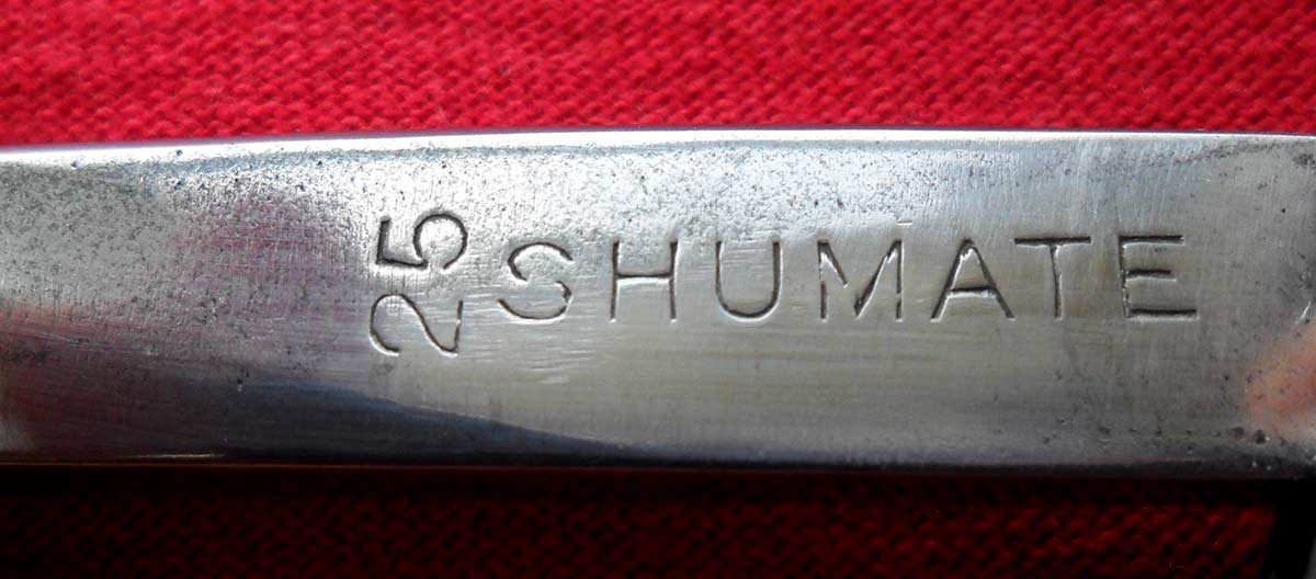 Надпись на обратной стороне эрля: Shumate Cutlery CO ST.LOUIS, MO. Сведения о производителе: http://straightrazorplace.com/razor-clu ... ciety.html" onclick="window.open(this.href);return false; Довольно популярная американская бритва. Предполагаю, что судя по надписи, бритва производства 1920-1932 года. Ручка - эбонит, по-видимому, ручка и пины родные. Состояние ручки неплохое. Хорошо и приятно затачивается, тонкая и мягкая бритва. Естесственно, заточена и полностью готова к бритью. Ширина полотна 17 мм, толщина в обухе 4,5 мм.