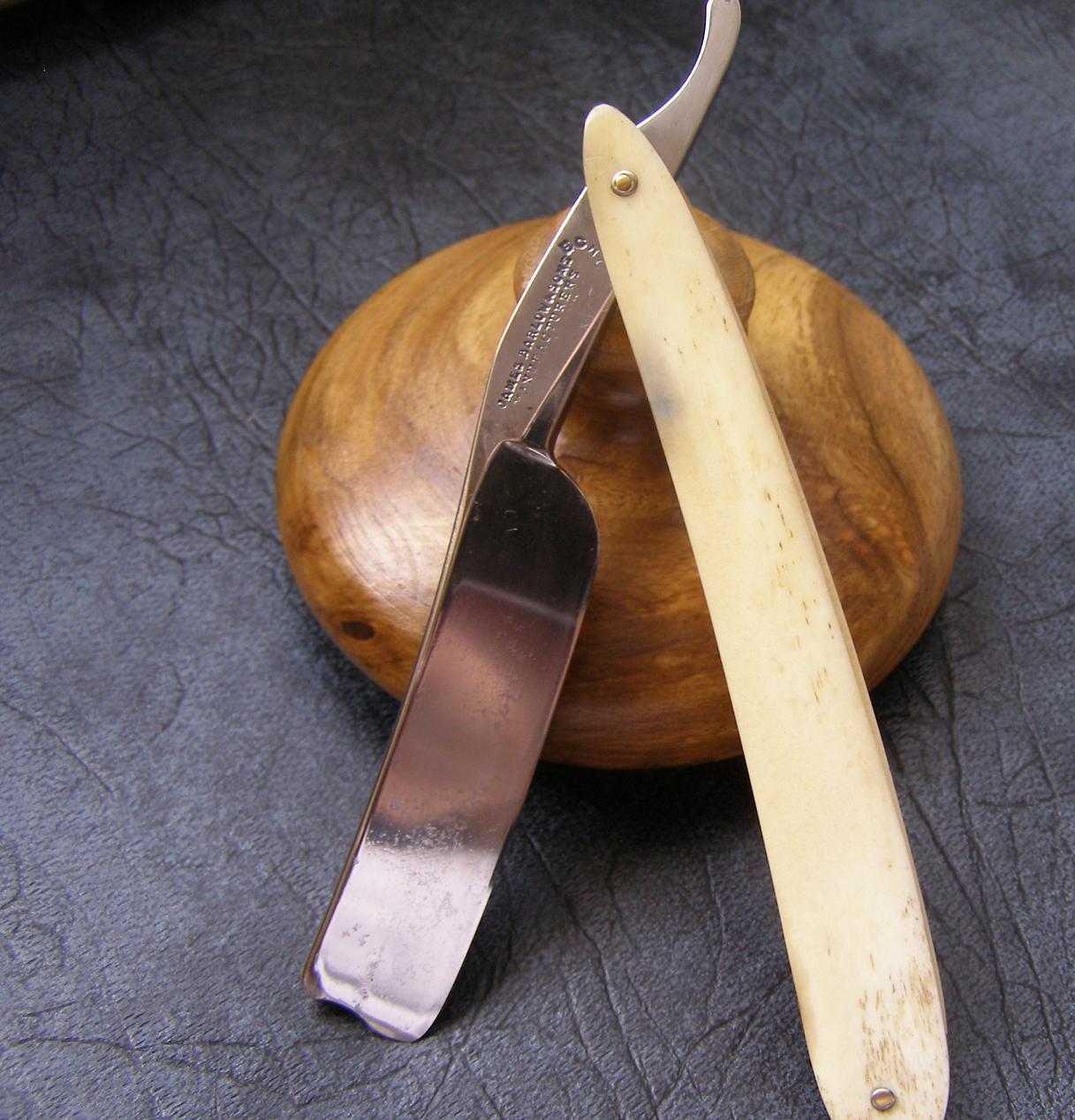 Бритва восстановлена и заточена. Оправа оригинальная - кость (трещина проклеена, имеет исключительно визуальный характер). Ширина полотна 6/8, обушок - 5,1