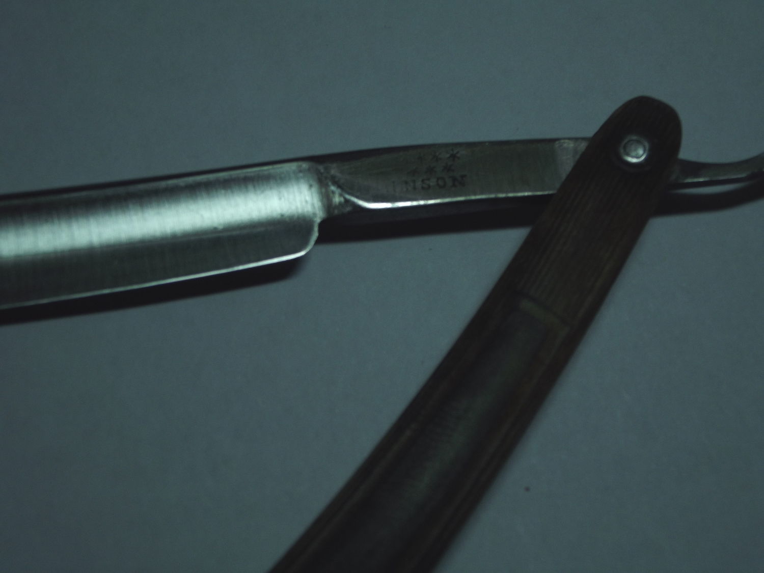 Бритва от деда, помогите определитьВыпросил сегодня у знакомого дедули бритву непонятного толком производителя и неопределенного возраста. Бритва принадлежала человеку, который родился где то лет 100 назад в Тверской губернии, отцу моей учительницы. Бритва на мой взгляд кустарного производства, ручка из рога или кости. Имя видно не полностью - inson (впереди возможны еще одна-две буквы) и семь звездочек. Есть еще знак, похожий на цифру, точнее половинка знака, возможно - 3. Насечек снизу эрла нет, сзади знаков нет. Может кто сможет определить, что за бритва. Дедуля сказал, что возможно дореволюционная.