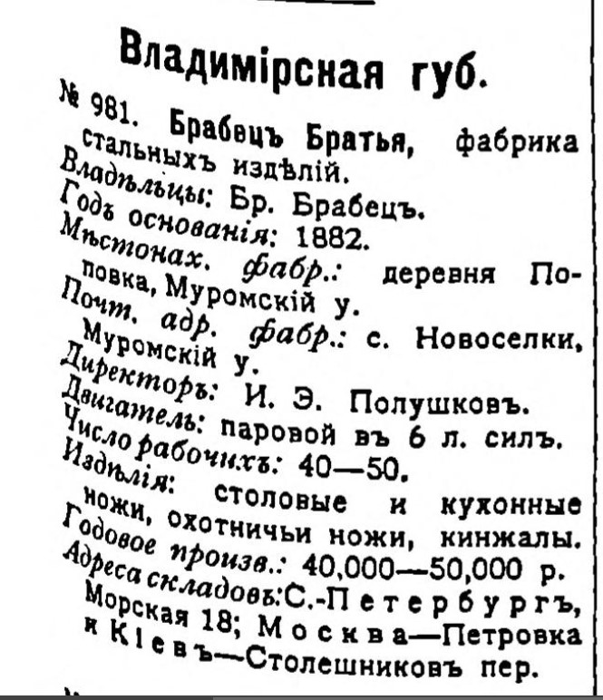 стальных изделий братья Брабец В дер. Поповке Владимирской губ. Муромского уезда. _________________________________________________ Главные заслуги процветания фабрики принадлежат основателю фабрики Матвею Оисповичу Брабецу и управ. фабр. Муромскому *******ну Е.Е. П*********. Производство: ножи, вилки, щипцы, кухонные приборы и проч. Годовой оборот до 40.000 руб. На выставках фирма получила много почётных наград. На Всероссийской Выставке в Нижнем-Новгороде 1896 года фирма награждена бронзовой медалью. Все говорят, что мы в месте…