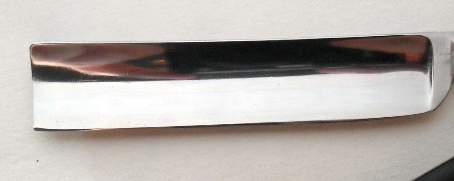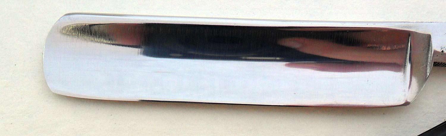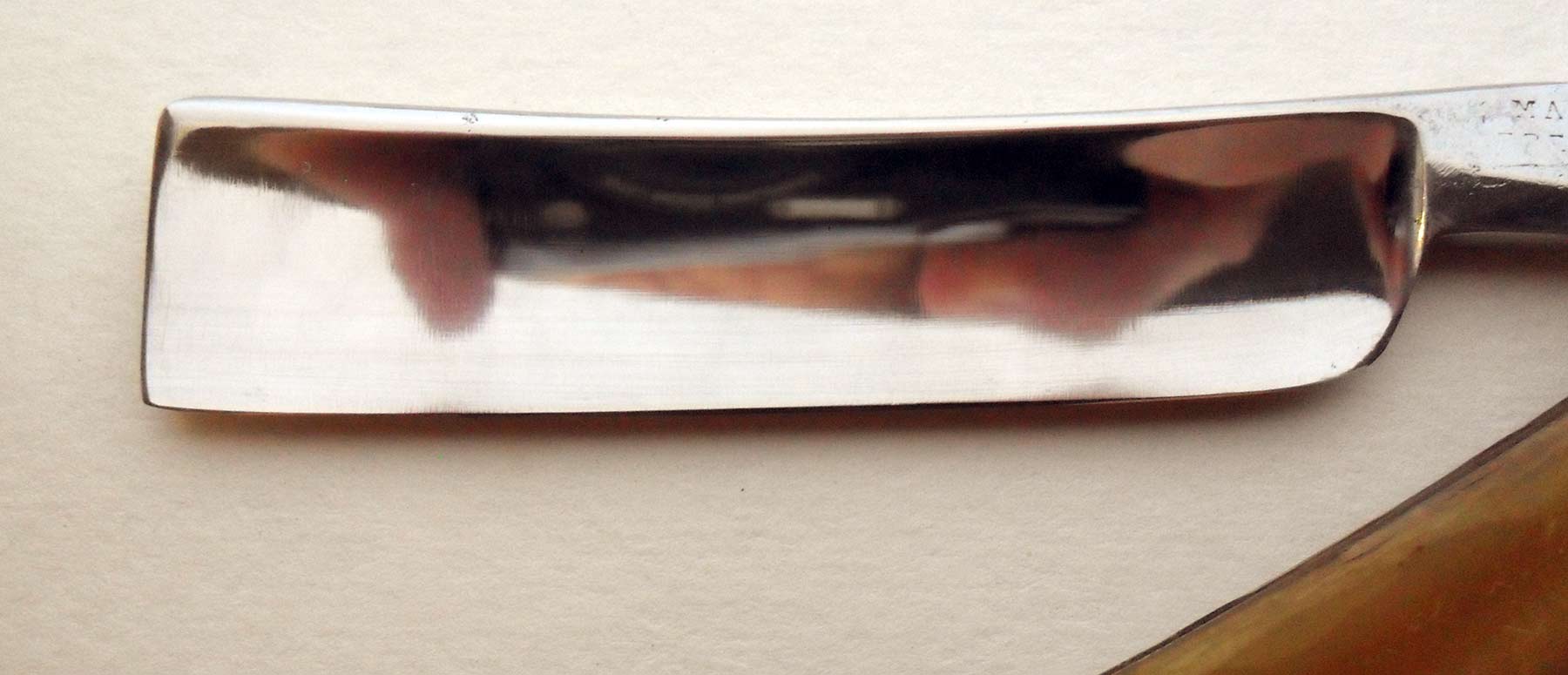 На бритве нет клейма производителя, причем уверен, что его там никогда и не было, а не просто стерто при восстановлении. Потому что следов существенного съема металла на эрле нет, при такой глубине штампа, как на бритве, снимать надо было много. Судя по материалу ручки, форме клинка и шрифту надписи предполагаю конец XIX века-начало XX века. Ручка - рог в отличном состоянии, клинышек - металл. Ручка, клинышек и пины, по-видимому, родные. Бритва приехала малоточенной, явно использовалась немного. Геометрия quarter hollow, бреет отлично, по ощущениям довольно близка к клину, хотя попроще в процессе. Естесственно, заточена и полностью готова к бритью. Ширина бритвы 18 мм, толщина обуха 6 мм.