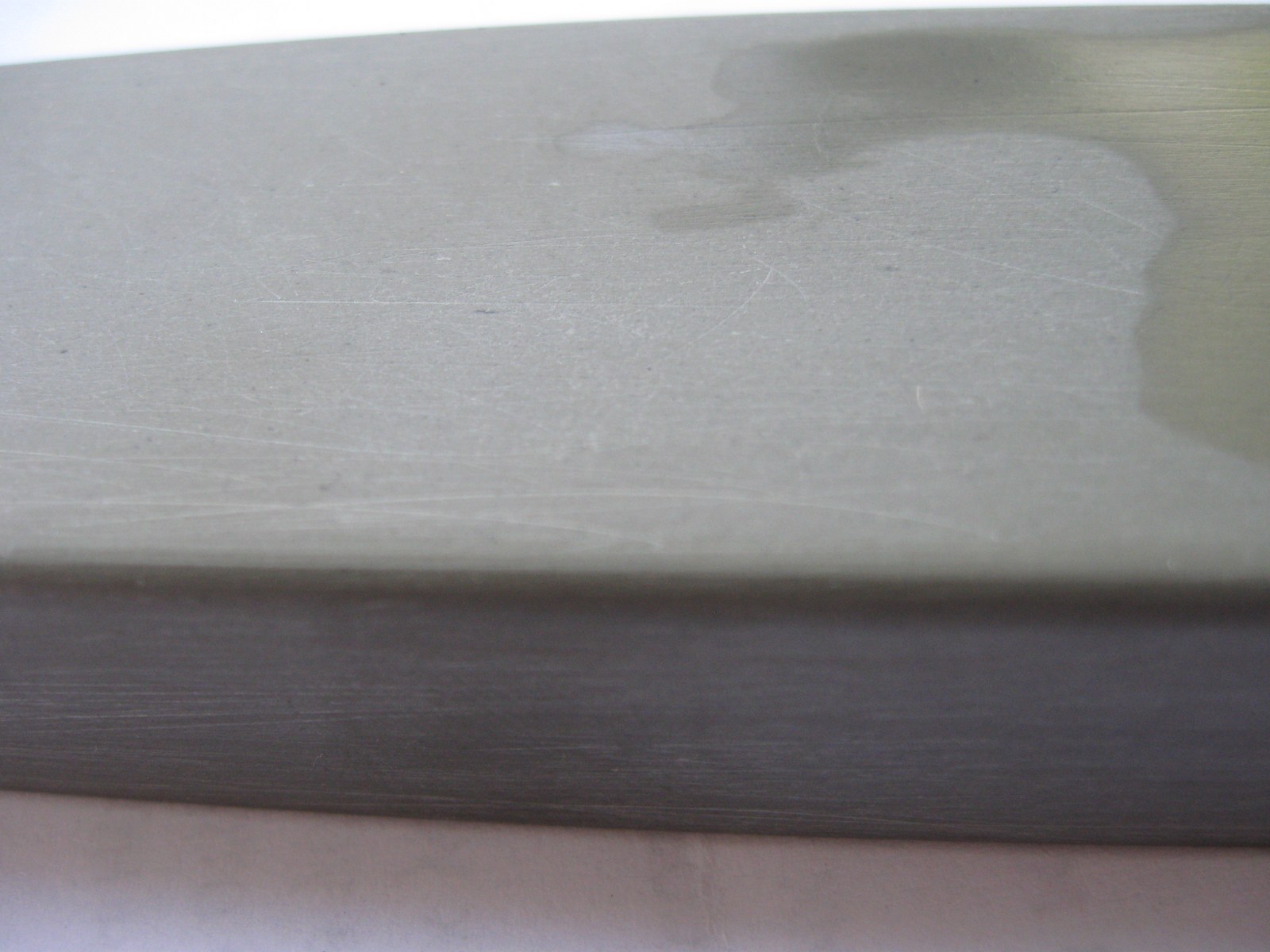 1) тяжеловатый 2) не пускает пузырей в воде 3) имеет ,довольно плотную структуру 4) на мог взгляд "мелкозернист",ближе к финишным камням. На "поцарапаность" поверхности ,не обращайте внимание.Камень будет ,еще доводиться. Специально смочил край камня водой,чтобы был виден контраст. У кого какие мысли или предположения?Заранее спасибо. P.S.Немного переделал фото.