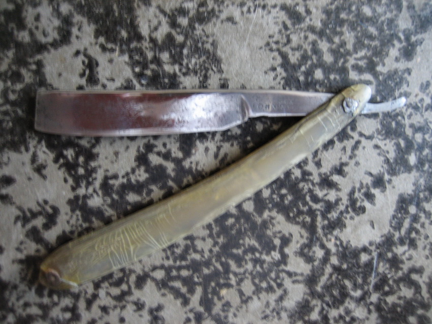 Бритва от деда, помогите определитьВыпросил сегодня у знакомого дедули бритву непонятного толком производителя и неопределенного возраста. Бритва принадлежала человеку, который родился где то лет 100 назад в Тверской губернии, отцу моей учительницы. Бритва на мой взгляд кустарного производства, ручка из рога или кости. Имя видно не полностью - inson (впереди возможны еще одна-две буквы) и семь звездочек. Есть еще знак, похожий на цифру, точнее половинка знака, возможно - 3. Насечек снизу эрла нет, сзади знаков нет. Может кто сможет определить, что за бритва. Дедуля сказал, что возможно дореволюционная.