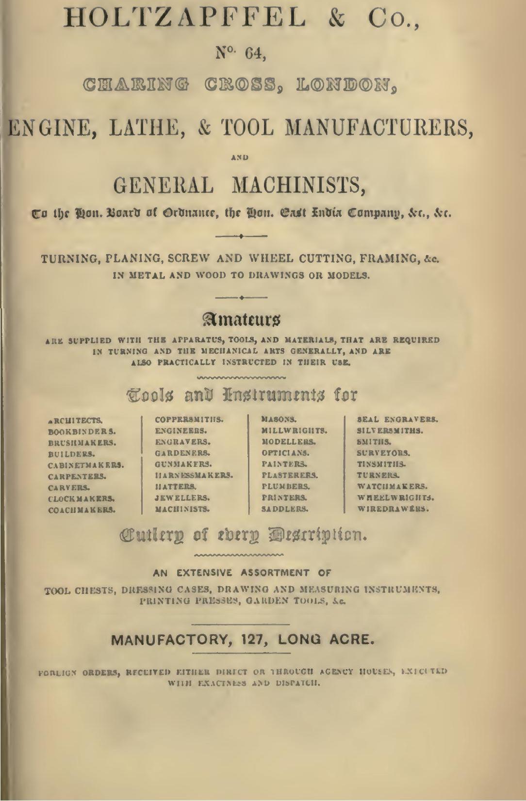 Holtzapffel & Co. was a tool and lathe making company in London, founded by German immigrant, John Jacob Holtzapffel in 1793. Второе слово Charing , а крест это аналогия полного названия адреса 64 Charing Cross Road, London. Spoiler Show Holtzapffel & Co. was a tool and lathe making company in London, founded by German immigrant, John Jacob Holtzapffel in 1793. The firm specialized in lathes for ornamental turning, something that was a popular leisure occupation for gentlemen at that time. Many ornamental lathes were bought by the aristocracy, and those made by Holtzapffel & Co. were considered the best. Between 1785 and 1787, John Jacob Holtzapffel moved from his native Alsace to live in London. In 1793 he started an engineer’s tool business and he sold his first lathe on 31 June 1795, for £ 25-4s-10d, an enormous price at the time. All of Holtzapffel’s lathes were numbered and by the time he died in 1835, about 1600 had been sold. The business was located at 64 Charing Cross Road, London. John’s son, Charles Holtzapffel (1806–1847) joined the firm in 1827, and continued to run it after his father’s death. He started a five volume series of books entitled Turning and Mechanical Manipulation, containing some 3000 pages, and which came to be regarded as the bible of ornamental turning. The first three volumes were published in 1843, but the final two volumes were completed and published after his death, by his son, John Jacob Holtzapffel (1836–1897). Charles Holtzapffel died in 1847, and his wife Amelia ran the business until 1853. In 1867 Charles and Amelia’s son John Jacob II became head of the firm in 1867. He ran the firm until 1896 and died in 1897. A nephew of Charles, George William Budd, became head of the firm in 1896, but after the end of the nineteenth century, ornamental turning went out of fashion, and sales declined Ede, bibe, lude, rade