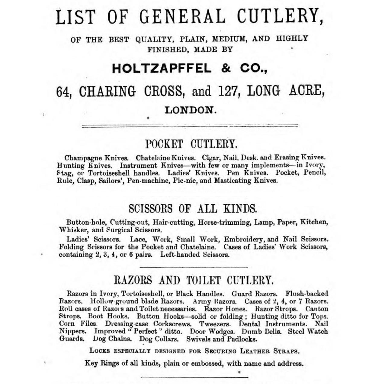 Созданный Jacob Holtzapffel в Лондоне, в 1792 году знаменитый Дом Holtzapffel and Co № 64 Charing Cross London, занимался производством механических инструментов, станков, огромного количества различных инструментов и изделий, ножей, штопоров и кухонных аксесуаров.