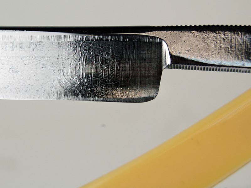 Написано английским готическим шрифтом. Причём уж совсем мудрёным. Хоть у меня и есть образцы готических шрифтов - но этот совсем перемудрили. После 2-часовых раздумий, основываясь на сравнениях шрифта, сделал умозаключение - на полотне бритвы выбито "Brand Forged". Причём по-английски. Между словами нарисована рука с молотом под солнцем, бьющая по наковальне...