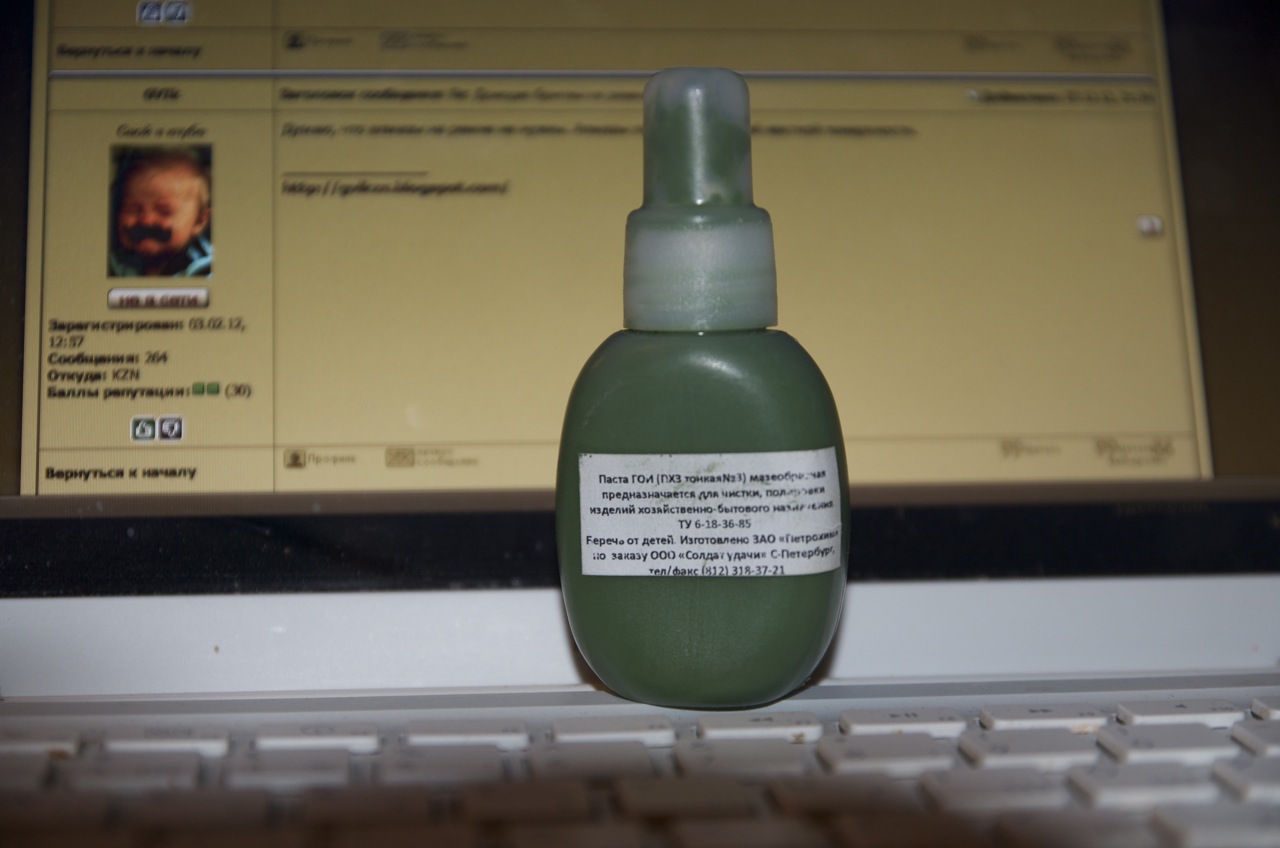 Re: Доводка бритвы на ремне с пастойПо цвету увы не определить номер ГОИ, подумайте сами от чего зависит насыщенность зеленного цвета в пасте - от размера частиц оксида хрома, или от их концентрации в общей массе вещества. От процентной доли этого хрома в массе пасты конечно же. Да, концентрация хрома так же зависит от номера пасты, но эта зависимость была лишь в те далекие былинные времена настоящей ГОИ по ГОСТу, а не ТУ, сейчас по цвету не определить номер.