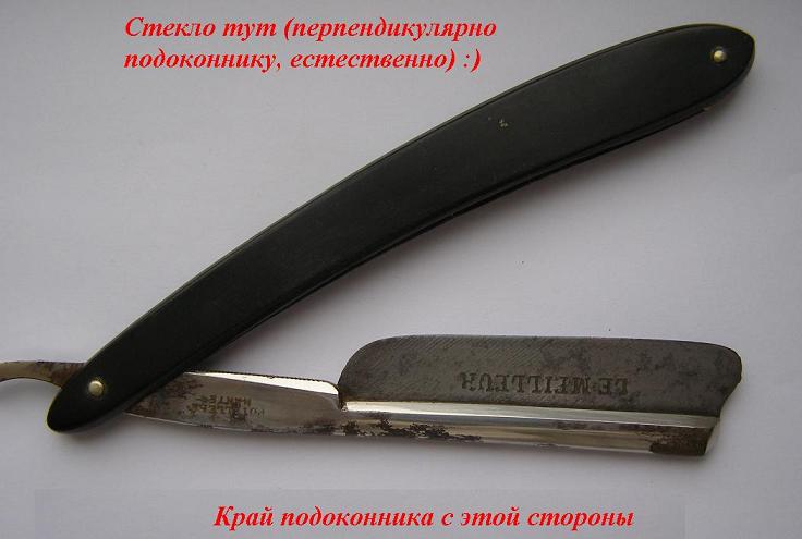 Re: Как ДОСТОЙНО сфотографировать опасную бритву?..Ну и чего непонятного uriuz написал?! Я с некоторых пор (как зима наступила) тоже так фотографирую (в солнечные дни естественно без извращений): располагаешь бритву на подоконнике обушком к себе, соответственно кромкой к плоскости стекла. Потом фото в редакторе поворачиваешь на 180 градусов...всё.