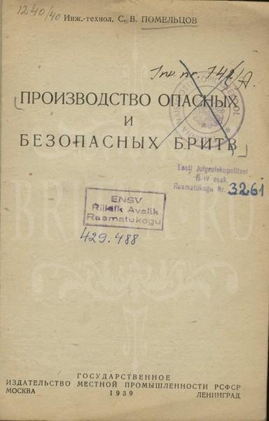 Брошюра *Ремонт опасных бритв*Кстати, вот еще книжечка интересная - "Производство опасных и безопасных бритв" С. В. Помельцов 1939 г.в.