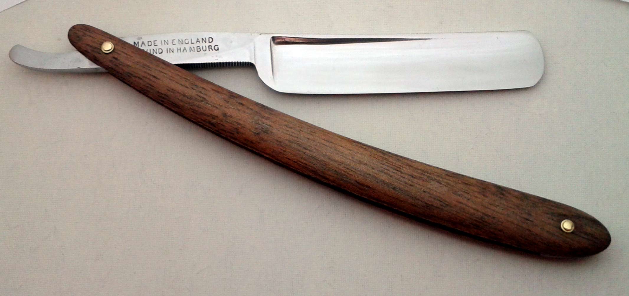 Обратная сторона эрля: MADE IN ENGLAND ROUND IN HAMBURG Сведения о производителе: http://britva.ru/forum/viewtopic.php?f=28&t=884" onclick="window.open(this.href);return false; Ручка - красное дерево с пропиткой, клинышек из металла. Бритва довольно мало была в использовании, геометрия близка к заводской. Заточена и полностью готова к бритью. Ширина полотна 15,5 мм, толщина в обушке 4 мм. Цена 65 евро, доставка включена.