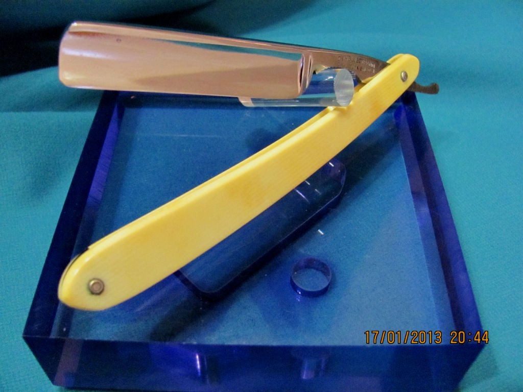 Параметры: ширина полотна 16.5 мм, обух 4.3 мм Ручка: пластик, собственная работа, дизайн в духе современности. Инфа по ТМ: http://britva.ru/forum/viewtopic.php?f= ... lit=Figaro" onclick="window.open(this.href);return false; Состояние: так как возраст почтительный, имеются следы времени. Заточена и готова к бритью. Продана. Figaro Show