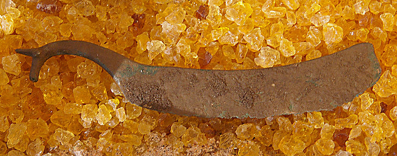 Медные лезвия, часто попадающиеся в Карфагене, на Сардинии и Ибице, вероятно, более пунические, чем другие предметы западного финикийского искусства. Хотя некоторые из них найдены в захоронениях VI века и более ранних, подавляющее большинство обнаружено в могилах IV века и более поздних могилах Сте-Моник и других некрополей.