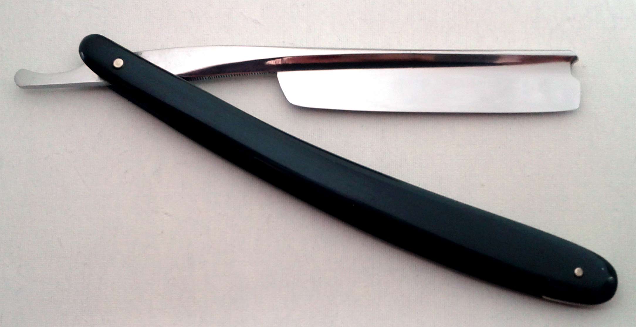 Ручка - натуральный материал. Что именно это - рог или черепаха, я не берусь утверждать. Читал споры об этом, убедительных доводов не увидел. Поэтому точным определением, при желании, сможет заняться будущий владелец. Ручка в неплохом состоянии, имеются щербинки, но в целом прочности ничто не угрожает. Опробовал в бритье - приятно бреет, чисто и комфортно. Заточена и полностью готова к бритью. Ширина полотна 16.5 мм, толщина в обушке 4.5 мм. Цена 75 евро, доставка включена.
