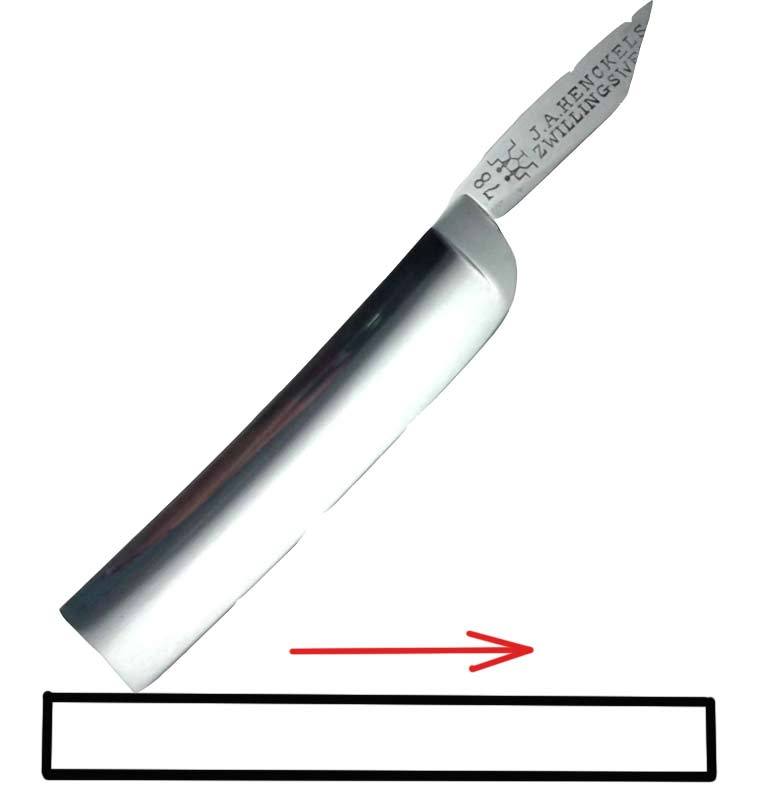 Re: Решился бриться опасной бритвойЭту проблему легко если не полностью устранить, то хотя бы уменьшить в разы. Для этого нужен мелкий брусок типа М10-20 либо от 800 грит и мельче. Давить не надо, легко проводите по нему кончиком по прилагаемой схеме, достаточно пути по камню всего в несколько сантиметров.