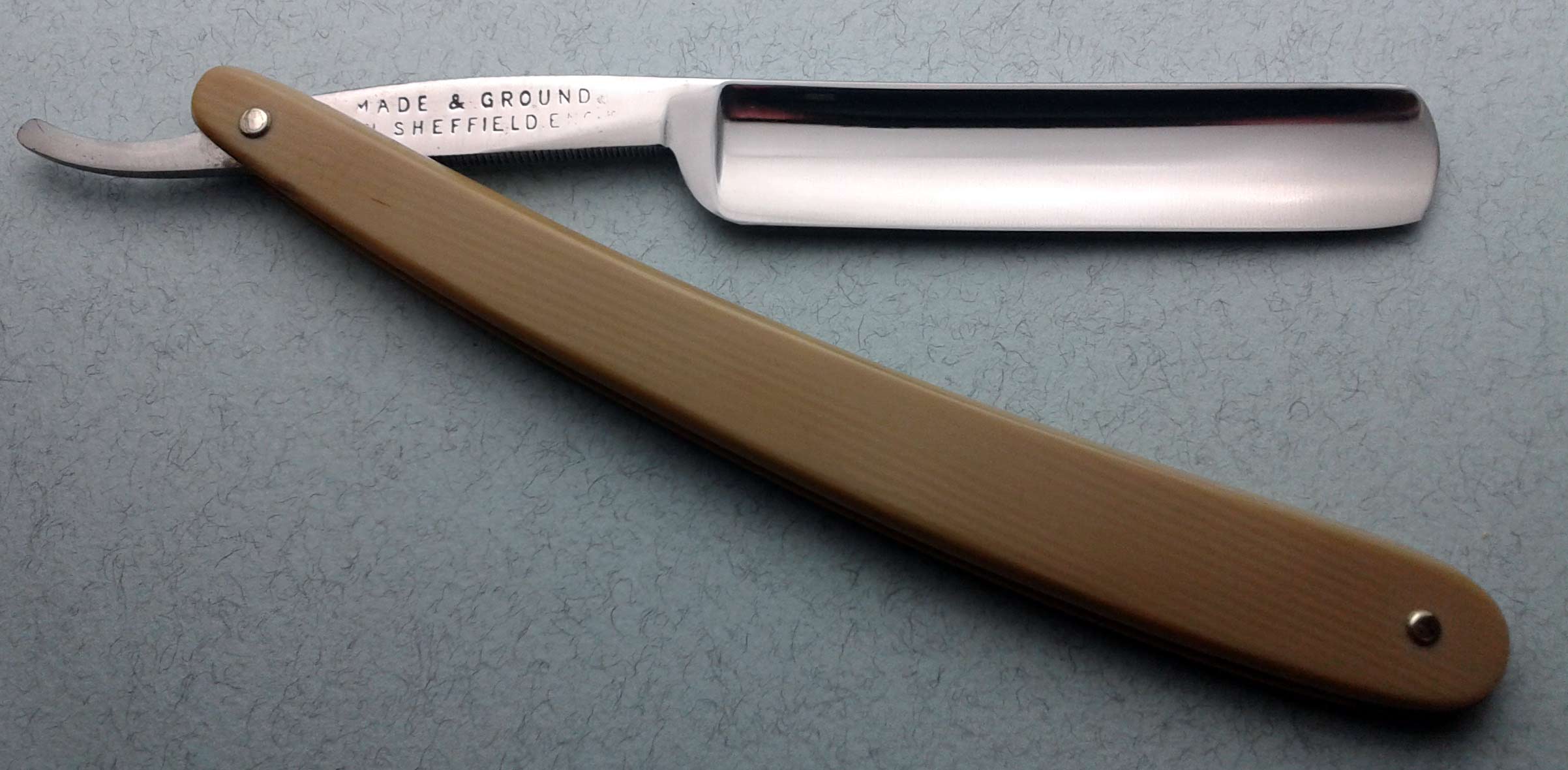 Сведения о производителе: http://britva.ru/forum/viewtopic.php?f= ... lit=haddon" onclick="window.open(this.href);return false; Ручка - целлулоид, имитация слоновой кости - в отличном состоянии, клинышек - металл. По-видимому, ручка, клинышек и пины родные. Заточена и полностью готова к бритью. Ширина полотна 17 мм, толщина в обушке 4.5 мм.