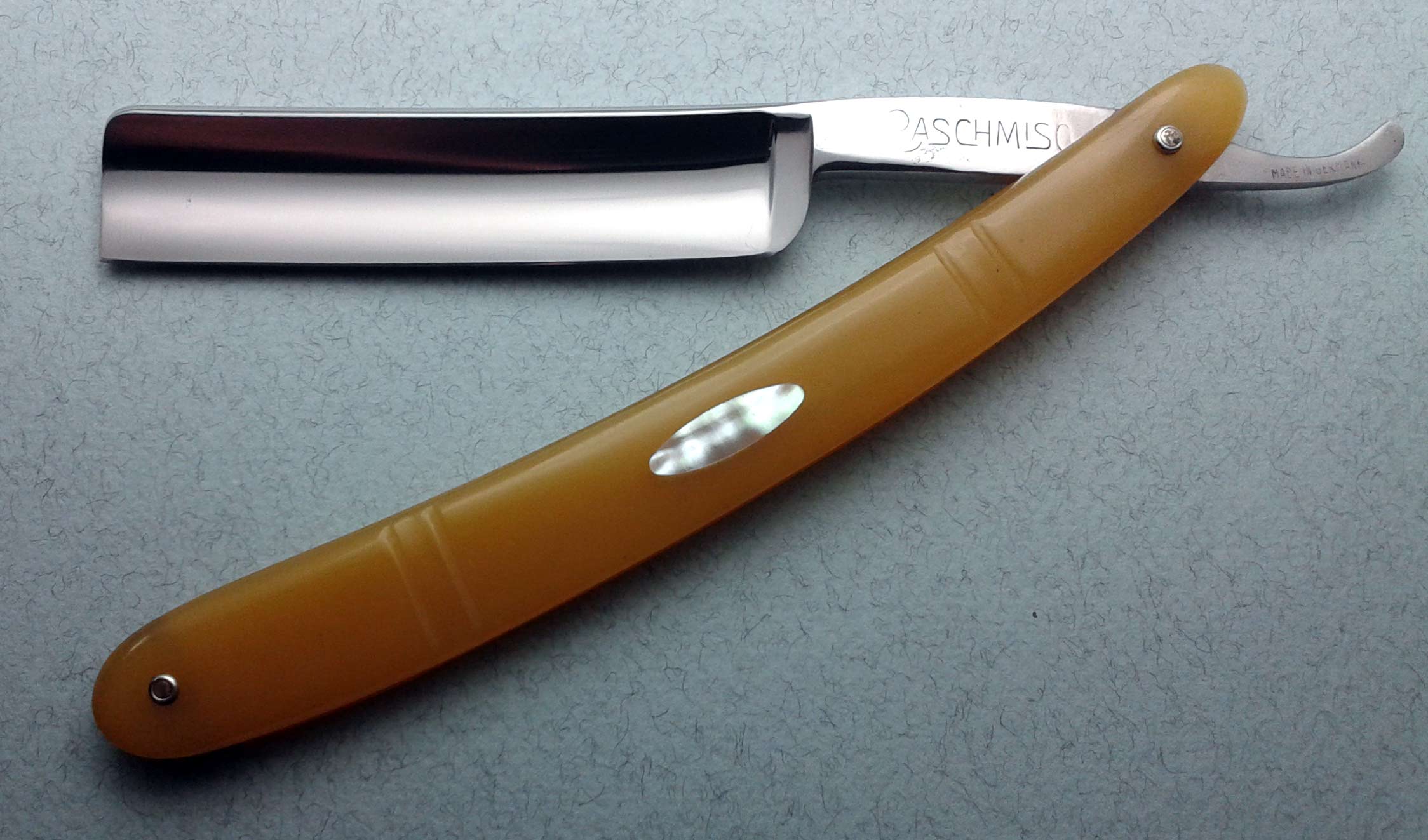Надпись на хвостовике: MADE IN GERMANY Ручка - целлулоид, посередине перламутровая вставка. Имитация рога, но я не знаю какого именно - есть столовые ножи из такого же по виду натурального материала. По-видимому, ручка, клинышек и пины родные. Заточена и полностью готова к бритью. Ширина полотна 17 мм, толщина в обушке 4.5 мм. В комплекте родной футляр в приличном состоянии.