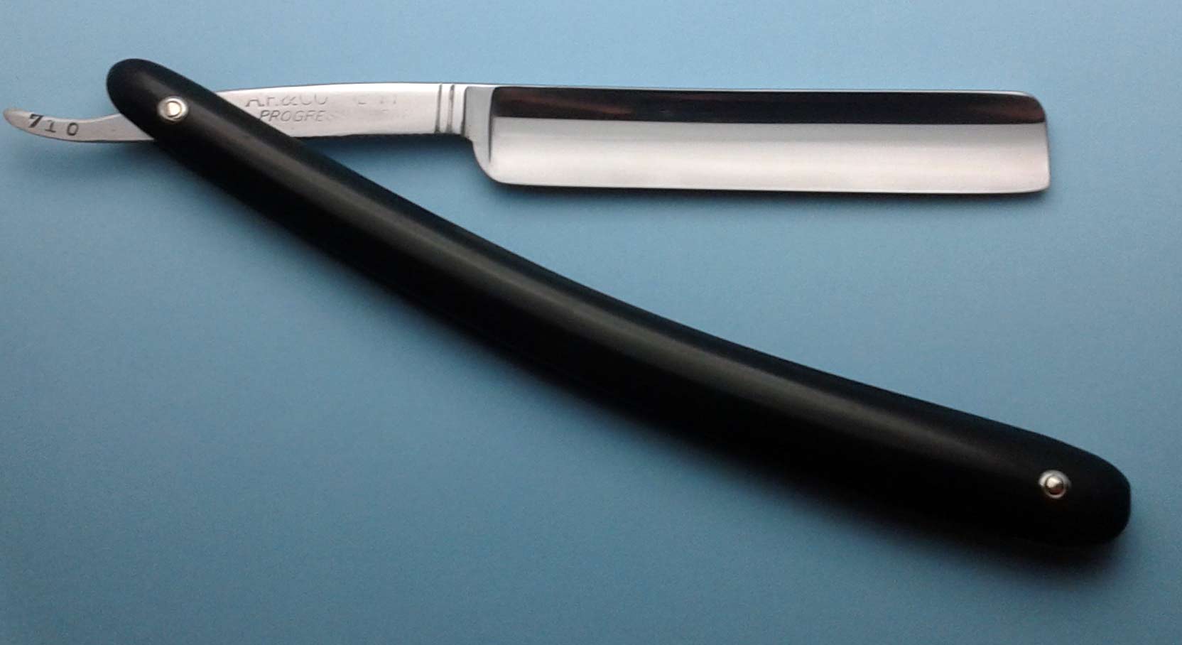 Обратная сторона эрля: A.P.&CO NEW YORK PROGRESS BRAND Ручка - эбонит, в отличном состоянии, родная. Бритва точилась немного и аккуратно. Коррозии также было немного, так что можно говорить, что бритва довольна близка к своему заводскому виду. Заточена и полностью готова к бритью. Ширина полотна 13.5 мм, толщина в обушке 4 мм. В комплекте родной футляр в приличном состоянии.