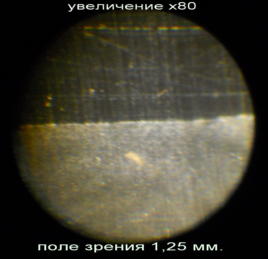 Вот фото границы на моей ЗТВ. Видна кристаллическая структура стали в виде матовой поверхности (внизу) и полированная поверхность (более темная вверху) ФОТО Show 32 года активно мусолю харю клинковой бритвой