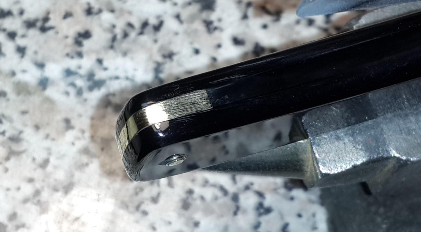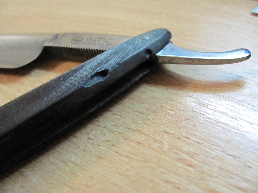 Старая ручка была покусана грызунами, полотно было грустно улыбчивым. Было принято решение одеть достойную бритву в копию оригинальной ручки и привести в порядок полотно. Кстати, сталь у Grelot действительно прекрасна. Получил огромное удовольствие при выполнение этого заказа. покусанная ручка Show