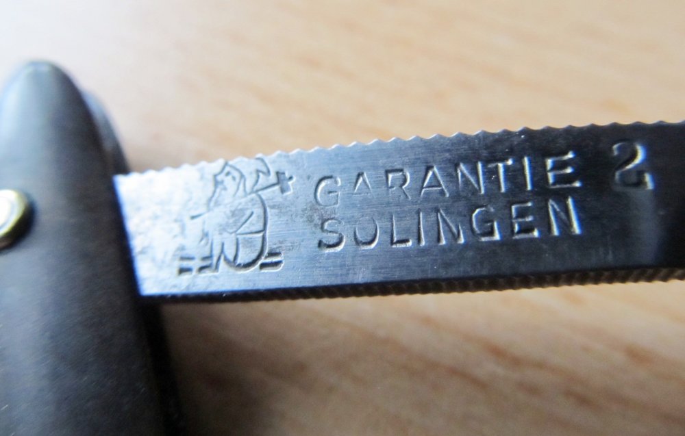 Но когда увидел надпись и картинку сзади - был в шоке... Надпись сзади гласит - IMPORTE d'ALLEMAGNE, далее сидящий на корточках гном с молоточком (знакомый нам по этой теме), подписанный снизу GARANTIE и число 757. Во как интересно... Ремонт опасных бритв, звонить с 11-00 до 23-00, +79267729357, (whats app, telegram, VK), спросить Олега.