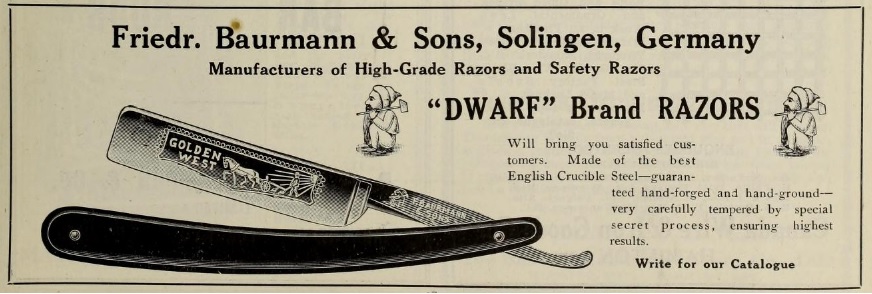 (мой вольный перевод, ссылка и оригинал статьи под катом) "Недавно открыт филиал FRIEDR. BAURMAN N & Sohne, Solingen, на Warren street, 58 , Нью-Йорк, который находится под непосредственным управлением Charles Baurmann. Фирма производит бритвы и экспортирует их в различные страны. Работы выполняются на их собственном заводе примерно 80 рабочими, которые выпускают около 3600 бритв в неделю. В общей сложности модельный ряд состоит из 300 моделей, 100 из которых, подготовлены для американского рынка и представлены в их офисе в Нью-Йорке. Из них и собираются заказы для импорта. Материал, используемый для бритв, из Шеффилдской стали, произведенный на «Kayser, Ellison & Co» Одна из новинок этого ведущего производителя является патентованная «безопасная бритва» под маркой «Monopol», причем безопасность гарантируется. На полотно бритвы устанавливается специальная, регулируемая, защитная планка из мельхиора и «безопасная бритва» тут же готова к использованию. Эти бритвы всегда есть в наличии для оперативного выполнения заказов. Из основных моделей отметим следующие: Бритва с 5/8 дюймовым лезвием и зеркальной полировкой (full crocus polished), с декоративной шлифовкой спинки. Установлена перламутровая ручка с прекрасной гравировкой. Надпись “Our Daisy” золотом вытравлена на полотне. Другая бритва, известная как «Comfort», ¾ hollow ground, с эрлем в слоновой кости, ручкой из слоновой кости и мельхиоровой вставкой. На бритве Ν 62 уникальный декоративный рисунок, с изящным шлифованием на спинке эрля. Также производятся «магнитные» (magnetic Razor) бритвы из шведской стали. Это ¼ hollow ground и 5/8 дюйма ширина лезвия. Магнитные свойства позволяют держать заточку дольше. Еще один бренд «Our Star» это 5/8 лезвие, вогнутость ¾ дюйма с фантастической антикварной ручкой. У этой линейки бритв ручки обрабатываются жемчугом. Сами ручки из слоновой кости, панциря черепахи, целлулоида или эбонита." Spoiler Show