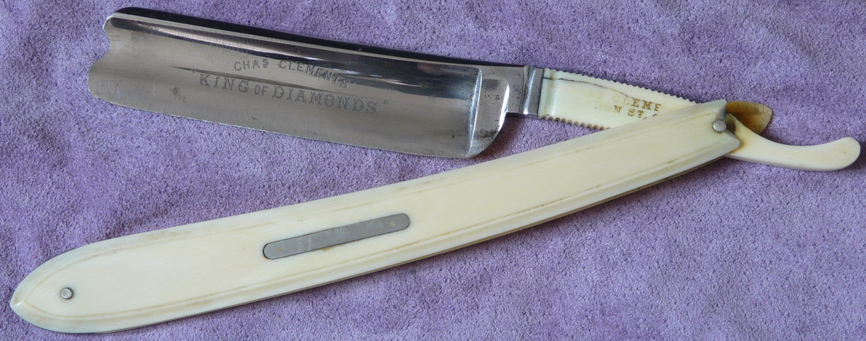 A Chas Clements Boxed pair Straight Razors. NR Manufacturers Info. Chas Clements 17 Billiter Street London in business 1911 These Cut throat Razors have a 5/8” + Hollow ground blade. They have dark horn scales with a lead spacer. Engraved on the tang are the words “CLEMENTS“ on the reverse is “17 Billiter St City Entirely made in Sheffield” On the blade is engraved “Chas Clements King of diamonds”“ A Chas Clements пара опасных бритв в футляре. Manufacturers Info. Chas Clements 17 Billiter Street London бизнес с 1911года Эти опасные бритвы имеют полотно 5/8” и это вполне обоснованное лезвие. Они имеют темные роговые оправы с приведенной распоркой. Гравировка на полотне - слова “CLEMENTS“ на обратной стороне “17 Billiter St City Entirely made in Sheffield” На лезвии есть гравировка "Chas Clements Король алмазов" .