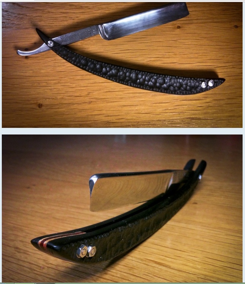 Работы с формами.Образовалась старая бритва, хорошо стерли обух, вот буду на ней тренироваться. Пока меня интересует вопрос, чем изменить форму перехода из ножки в лезвие вместо ступеньки на такой как мне нравится(на первой картинке), пока только представляется ручная работа с наждачкой и надфилями.