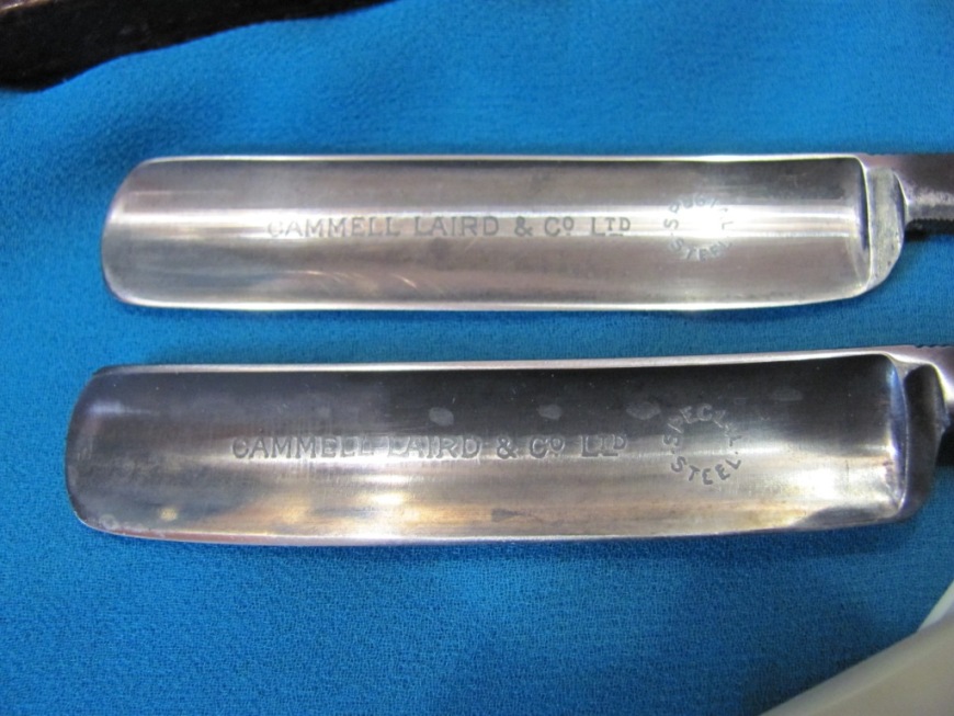 Ну тут гадать не надо, символика фирмы на полотне, это активная реклама фирме, чью сталь использовали и гарантия качества конторе, которая производила бритвы из этой стали. Конкретно на моей парочке нет штампа фабрики где произведены бритвы, это скорее всего бритвы сделанные как подарочные по заказу CAMMELL, LAIRD & CO LTD