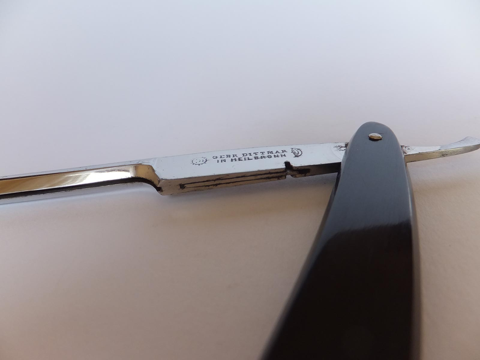 На сей раз немец-фреймбек, со сменными лезвиями и интересным замком пружинного типа. Весь секрет в самом лезвии. Оно выполнено с развитым хвостовиком в виде крюка для входа в замок и скобой-ограничителем на носу,в верху лезвия. Лезвие по пазу в обухе вставлялось от носа к пятке до характерного щелчка. Крюк на хвостовике лезвия заходил в зацепление с крюком замка и удерживался плоской пружиной в закрытом положении. При снятии лезвия требовалось нажать на пластину внизу эрля для сжатия пружины и освобождения лезвия из замка. Конструкция кажется более чем нелепая и сложная, но тем не менее имеет место быть.