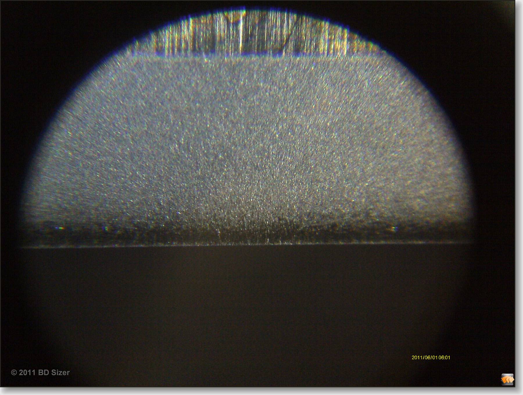 Приехал, наконец-то, ко мне один из заказанных китайских натуралов Yellow pulp stone. Ссылка, где покупал его, есть выше. Размер 200*50*24 мм. Гритность 2500-3000. Первое впечатление очень положительное, но камень специфический. Связующее в нем, чем то, напоминает спрессованную глину, да и цвет соответствующий грязно-желтый. Твердость камня, низкая, я бы даже сказал, что он немного рыхловат. Очень, очень легко образует суспензию, достаточно сделать 3-4 круга бритвой, а доводил его буквально пять минут. Кстати китайцы одну сторону типа вывели, убрали все самые крупные риски, так что осталось совсем немного над ним поработать. Инородных включений нет, только с торца, на нерабочей поверхности, попался один кусочек, размером с ушко иголки. Кусочек не пойми чего, но опять таки чего-то мягкого. По размеру абразивные зерна схожи с китайским трехтысячником. Камень работает довольно шустро, на мой взгляд, возможно из-за того, что быстро оголяются новые зерна. Вобщем взял я своего замученного китайским асфальтом стиза и стал экспериментировать. На Yellow pulp stone я перешел после тысячника, сколько сделал кругов не знаю, не считал, обычно ориентируюсь по состоянию рк. Затем глянул в микроскоп, ну со шлифованной поверхностью все понятно, камень не пожалел суспензии, а вот чего на рк произошло пока не понял.  Она почемуто слишком гладкая для этой гритности получилась. На тысячнике риски были до рк, и начала кое-как сбривать волосы. Возможно это связующее камня так отполировало краешек рк, непонятно и как-то нелогично  почему тогда не всю поверхность. Когда точил, то побаивался, что камень быстро потеряет геометрию из-за такого количества выделяемой суспензии, но оказалось напрасно. Замачивать его точно не стоит, достаточно намочить и работать. Имхо, при замачивании его можно просто расколоть. Рекомендую попробовать этот интересный камень, тем более цена на него совсем смешная. Натуралы мне нравятся все больше.