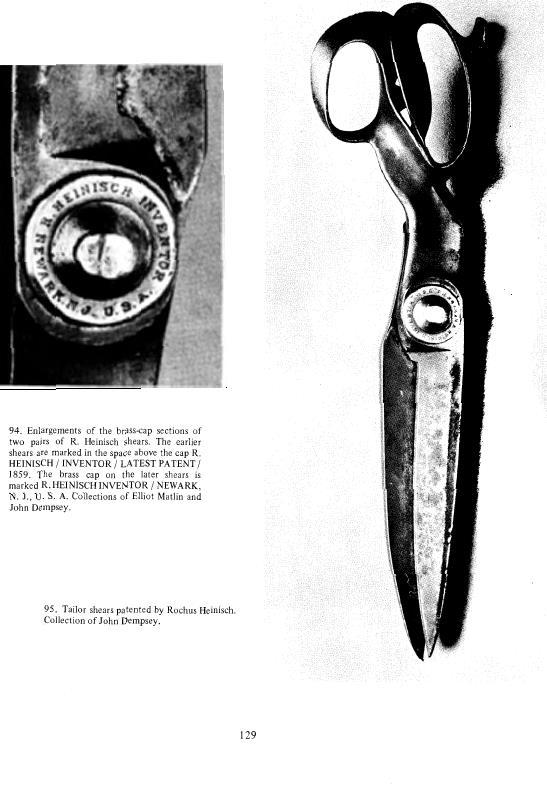 Rochus Heinisch и Jacob Wiss были пожалуй два из самых важных производителей портных ножниц на протяжении 19 ст. Rochus Heinisclt родился в Богемии, Австрия.? 14 февраля 1801 г. Он изучал производство хирургических инструментов в Австрии и Франции. В начале 1820 годов он переехал в США, вскоре после прибытия его посетила идея о производстве ножниц из ковкого чугуна где и сталкивается со сталью. Он был первым, кто запатентовал "портные" ножницы и первый, кто запатентовал сварку стальных изделий. Он начал производство своих усовершенствованных ножниц в Элизабет, Нью-Джерси в I829, но через несколько лет переехал в Ньюарк, где он основал дело по изготовлению столовых приборов . В 1835 Ньюарк каталоге он был указан в качестве производителя хирургических инструментов и других приборов в том числе и столовых при Карьер-стрит возле Вашингтон-стрит. Через годы его главной работой было изготовление ножниц для портных (своих запатентованных), которые оказались очень пригодными и очень ценными для тех, кто был в этой сфере деятельности. Ножницы, которые ранее использовали были английского производства и ручки были настолько неудобной формы, что портные называли "их "инструментами для пыток". Говорили, что "Его" ножницами, один человек может сделать столько, сколько сделают четыре человека другими ножницами. 131 страница Иаков Wiss родился в Soleure, Швейцарии. Я декабря 1817 года изучал торговля хирургического инструмента и производителей в этом городе. После завершения своего обучения он работал как подмастерье, в других частях "Европы. 'В Августе I847 года Он переехал в Нью-Йорк. От туда он отправился в Ньюарк, где он устроился на короткое время и Rochus Heinisch Затем начал свой бизнес . В 1848 году в каталоге он представлен как ножовщик и оружейник на 7-й Банк-стрит. Однако в этом списке он был всего лишь год.Его праправнук Nonnan Wiss, сказал мне, что он уверен, что прапрадед не имел отношение к оружейному делу. Он считает, что друг (Иакова) , который прибыл из Европы в Ньюарк и на некоторое время, и есть тот самый оружейник. 132 страницаКогда Иаков впервые занялся своим бизнесом, движущей силой для его станков служила (механическая энергия) Но в I853, когда он переехали на 26 Street он начал использовать паровую энергию. Благодаря популярности его столовыми приборами он был вынужден расшириться в 1869 году и снова в 1872, для повышения производственных мощностей. После смерти Иакова 25 июня. 1880 года его сыновья Фредерик CJ. Висс и Луис Т. Висс, взял на себя управление компанией. Бизнес продолжал развиваться, и в 1887 году Они построили большой завод на 33 Литтлтон Avenue, Newark. Хотя Рохус Heinisch и Иакова Висс, изготавливали и другие приборы, такие как: ножницы, ножи, бритвы. и тому подобное, их основной частью (направлением) были портные ножницы. Рохус Heinisch в частности гордился патентом, которым он обладал на свои портные ножницы, и тем, что Он показал всему миру Их. Он ставил дату патента на ножницах, что было хорошей рекламой. Самые ранние из этих дат, которые видели, были 1859 года.(на ножницах) но несомненно, были и более ранние. Его последний Патент был внесен в 1863 году. Хоть и есть сведения, что Иаков Висс также ставил номера патентов, как рекламу, на свои ножницы, но таковы не попадались. Можно было бы полагать,(для большинства) что Иаков Wises Рохус Heinisch являясь основными конкурентами, враждовали по отношению к друг другу, по всем 