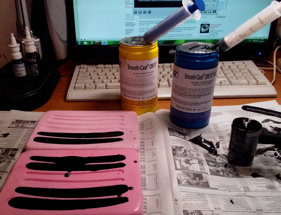 Для изготовления понадобятся: 1. Материал для формы. Я выбрал силикон Mold Max 30 розового цвета. 30 единиц по ШОРУ (шкала А) Состоит из двух компонентов; силикона и отвердителя. Силикон довольно вязкий, как эмаль ПФ-115, отвердитель жидкость алого цвета. Смесь 1:10 твердеет 24 часа. Твердость резины. 2. Материал для ручек. Я выбрал полиуретан Smooth Cast Onix черного цвета. 80 единиц по Шору (шкала D) Состоит из двух компонентов А и В, смешивается 1:1, время жизни 2,5 минуты, твердеет 40 минут. Твердость высока, материал сверлится, пилится и в то же время не хрупок. 3. Два шприца на 20 кубов и два куска силиконового шланга (я взял одноразовый аспирационный хирургический зонд и отрезал по15 сантиметров) Подбираем подходящую посуду для заливки формы. Наклеиваем на двусторонний скотч половинки ручек на дно посуды, обрабатываем восковым разделительным составом поверхности и заливаем силикон. Через 24 часа вынимаем форму и убеждаемся что она не имеет гадских пузырьков воздуха на рабочей поверхности. Набираем в шприцы компоненты и размешиваем их в полиэтиленовой (полипропиленовой) банке 15+15 мл. и заливаем в форму. На три пары ручек хватает 30 мл. Подводные камни. Посуду для формы и поверхность моделей смачиваем восковой эмульсией «Сэлтон» для обуви, иначе оторвать потом будет невозможно. Заливаем силикон с как можно меньшей высоты и в одну точку, иначе будут пузырьки воздуха в форме. Малое время жизни полиуретана весьма коварно, поэтому перемешиваем компоненты в темпе зайчика-энерджерайчика, примерно 30 секунд и очень быстро заливаем в формы. Помогаем растекаться зубочисткой. Форма должна быть строго горизонтирована, иначе будет брак. Готовые изделия сильно разогреваются. Вынимаем из формы, когда остынут до комнатной температуры и ждем еще 30 минут минимум, разложив на ровной поверхности лицевой стороной вниз. Через 24 часа можно пользовать. Пользуйтесь на здоровье, камрады.