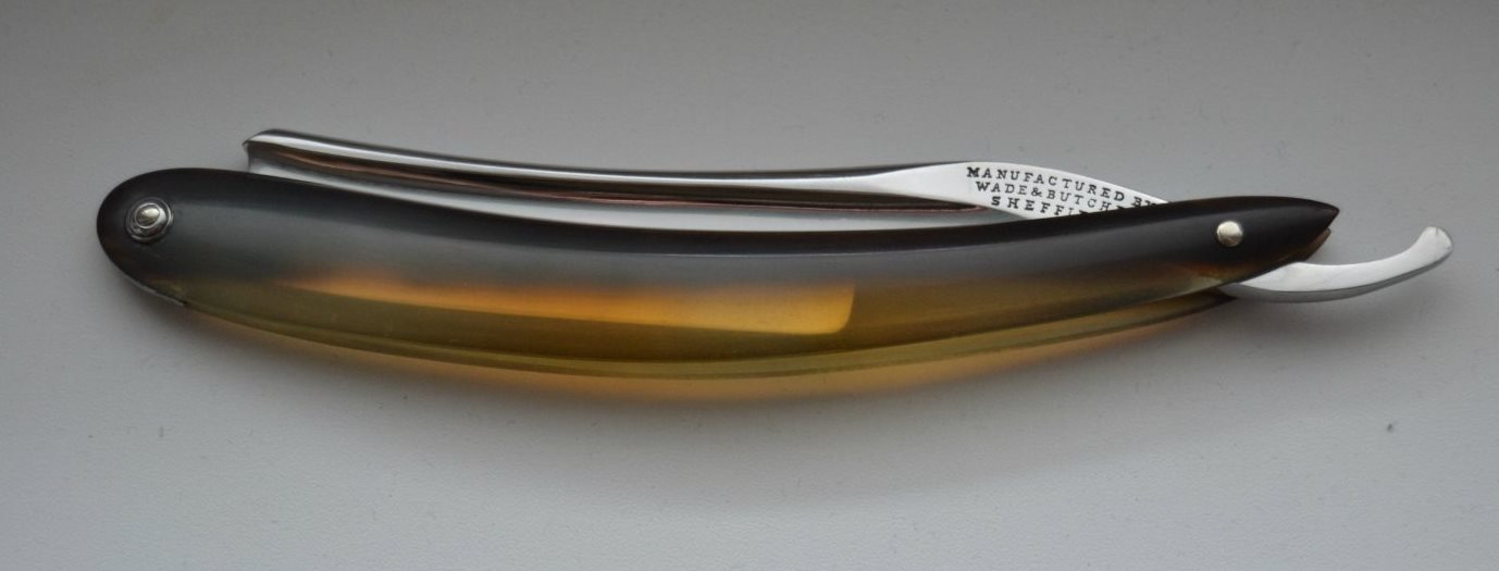 Немолодой французский квартерграунд Rameau Sens. Ручка рог, возле осевого пина заметны небольшие признаки расслоения, но в остальном и бритва и ручка в отличном состоянии. Костяной клинышек заменен на олово. Заточено. Продано