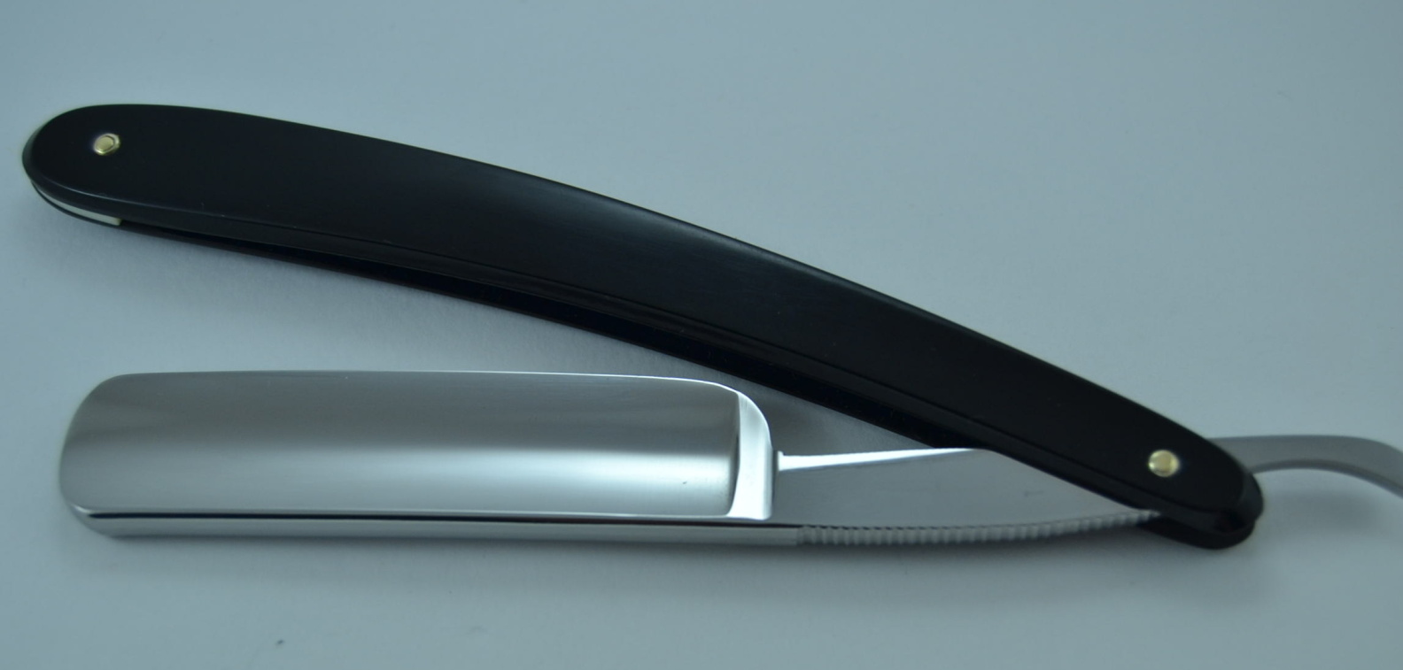 Английская бритва под торговой маркой Eclipse от Братьев Гилберт. Вогнутость 1/2, ширина 6/8. Необычная форма спинки. Новая ручка из рога буйвола насыщенной черно-белой расцветки. Рог очень высокого качества. В комплекте родной футляр гробиком в замечательном сохране. Заточена, готова к бритью. Продано Spoiler Show