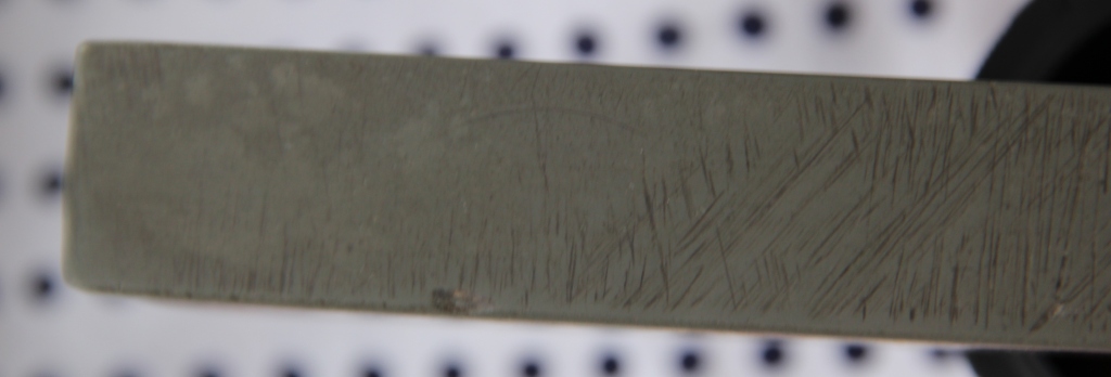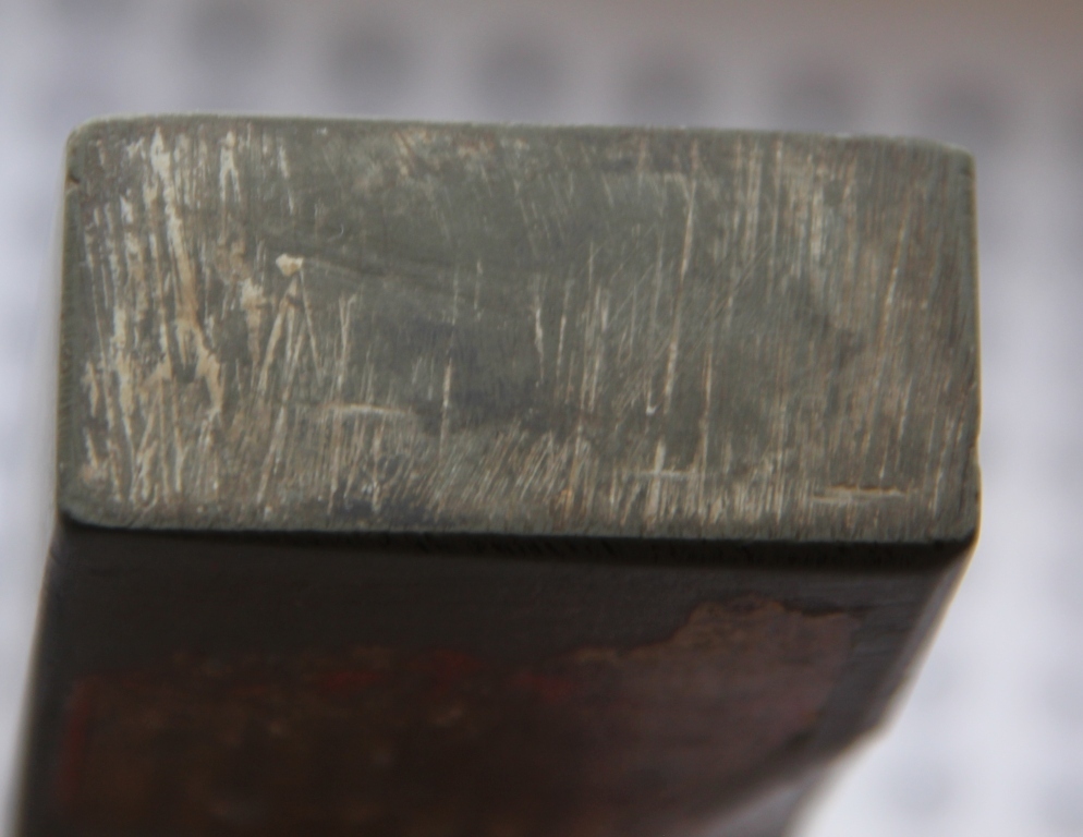 У меня в наличие два тюрингских сланца. Первый, темно-синий 5" ( длина 128мм, ширина 32мм) покупался здесь, второй - зеленый 5" (длина 126мм, ширина 38мм), заявленный как Эшер, покупался на ебэе. Оба очень мягкие ( сравнительно с Гуанси), легко остаются царапины. Cпил на торцевой стороне зеленого очень похож на фотографии сделанные уважаемым wren, у темно-синего следы от ножовки более грубые, и имеют одно направление.