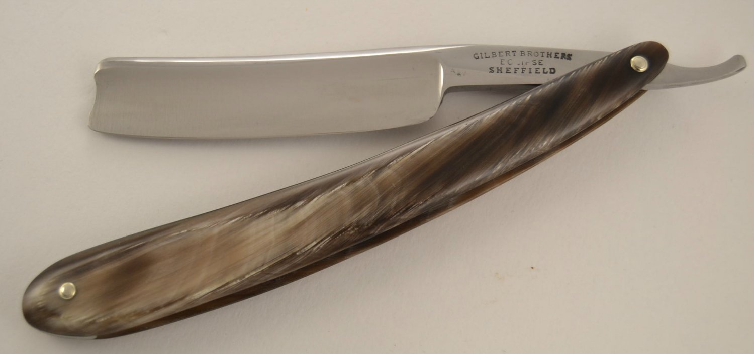 Английская бритва под торговой маркой Eclipse от Братьев Гилберт. Вогнутость 1/2, ширина 6/8. Необычная форма спинки. Новая ручка из рога буйвола насыщенной черно-белой расцветки. Рог очень высокого качества. В комплекте родной футляр гробиком в замечательном сохране. Заточена, готова к бритью. Продано Spoiler Show