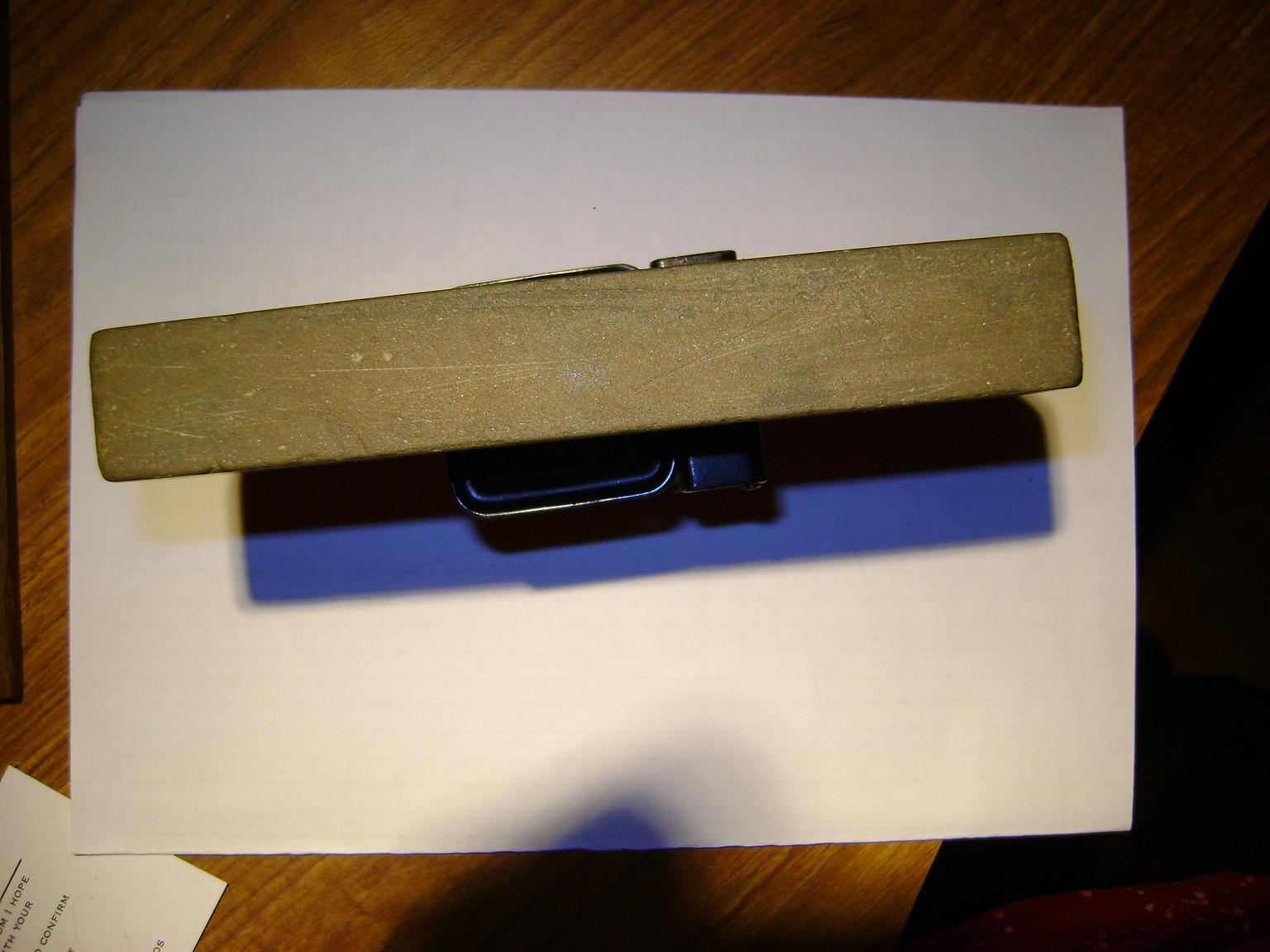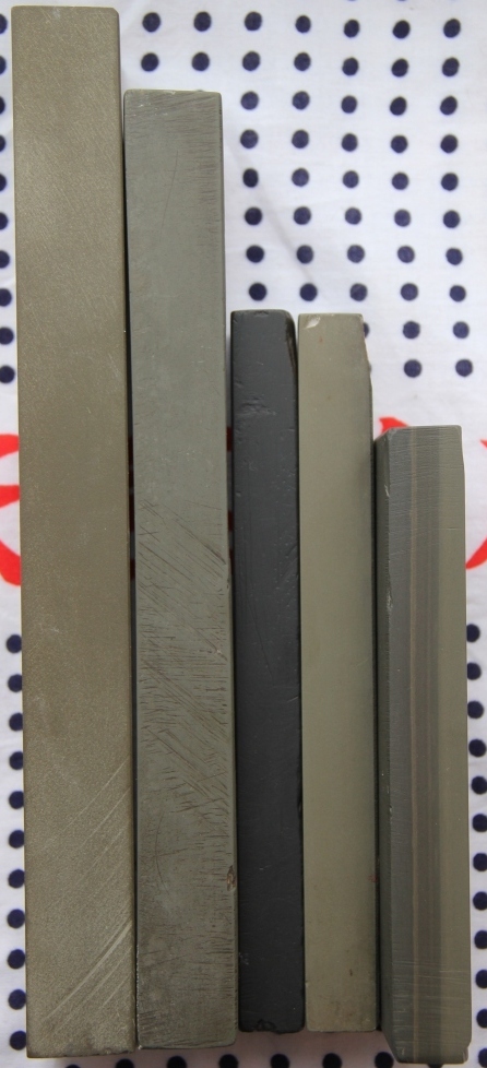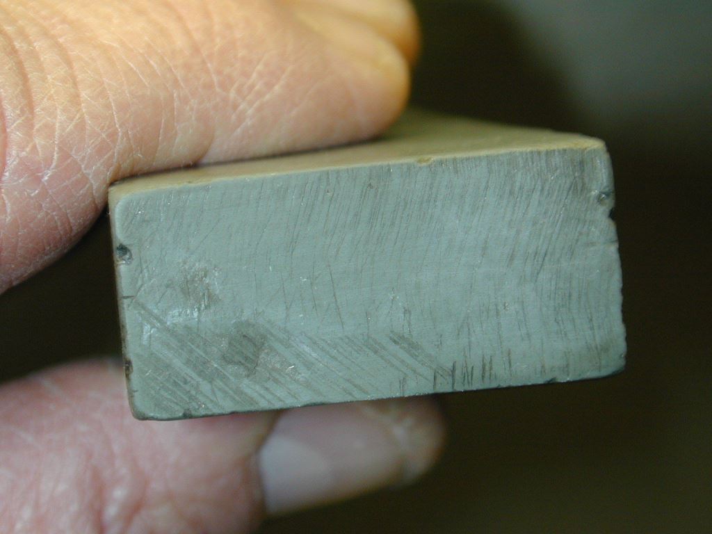 У меня в наличие два тюрингских сланца. Первый, темно-синий 5" ( длина 128мм, ширина 32мм) покупался здесь, второй - зеленый 5" (длина 126мм, ширина 38мм), заявленный как Эшер, покупался на ебэе. Оба очень мягкие ( сравнительно с Гуанси), легко остаются царапины. Cпил на торцевой стороне зеленого очень похож на фотографии сделанные уважаемым wren, у темно-синего следы от ножовки более грубые, и имеют одно направление.