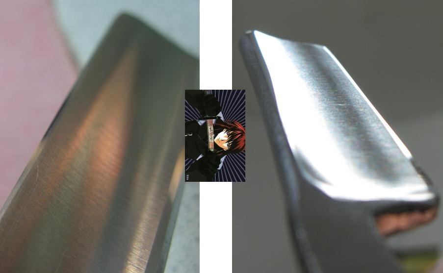 Итого: с использованием цусима-камня и цусима-нагура можно заточить бритву до состояния реза волоса на минимуме камней - 1000-цусима-финиш, но нужно следить за суспензией, хитрить и очень долго полировать кромку. Также отмечено постоянное микроскалывание кромки. Не ясно пока дело в бритве или в камне, но микропила держится постоянно и уходит только на финише. Зато для ножа это хорошо, поэтому тысячник+цусима-камень на кухню самое то. А для бритв надо покумекать как с ним быть, так-то камень достойный - быстрый, с однородным и тонким зерном - хорошая альтернатива котикулу и хватит надолго если не кокнуть, что сделать очень легко. А вот цусима-нагура отлично затирает риски на синтетиках до 6000 грит и может быть использовано вместо ботана. Но об этом потом - в следующем обзоре "о камне вакаса и его 5 друзьях". [spoiler=" фото кромки и самой бритвы после "цусима-гуанси-вакаса"] [/spoiler]
