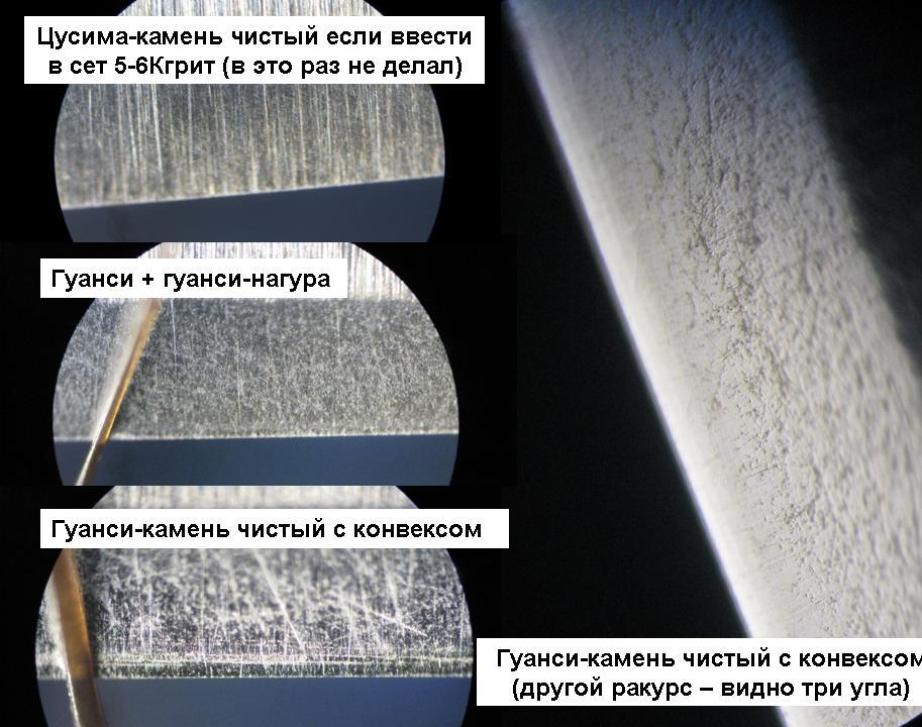 http://forum.guns.ru/forummessage/224/988330-96.html" onclick="window.open(this.href);return false; Общий вывод*: при работе с суспензией - её часто обновлять, при работе на камне - её чаще смывать. С цусимой-нагурой можно сделать скачок в 1-8Кгрит на синтетике, но лучше воспользоваться ещё одним камнем в 5-6Кгрит. Затем на финиш или кому куда. * - применимо в случае искусственного камня-основы, натуральные нужно исследовать Чуток фоток по схеме - 1000-цусима-гуанси Show Заточная схема (она же последовательность действий и фото) следующая - 1000-цусима-гуанси: 1000 грит Тайдиа чистый камень и с суспензией мягкой накаямы-нагуры 1000 грит (специально взял самый дешевый из имеющихся, возьмите нормальный) Тайдиа с суспензией цусима-нагуры с целью затереть риски тысячника (глубокие риски крест-на крест - это от него) Цусима-камень с суспензией цусима-нагуры чистый Цусима-камень (на фото представлены фрагменты сравнения камня с нанива сс 8000 и результат работы если на камень переходить не после 1000, а после 5-6000грит) Гуанси с суспензией гуанси-нагуры Гуанси чистый - на этом этапе сделал что-то вроде конвекссной заточки на три слоя изоленты (последовательно)...да просто так, обычно на один слой подымаю на финише если вдруг по каким-то причинам не вышел на кромку или образовались маленькие "зубчики". Бритва - голддоллар "две стрелы" из углеродки (на полотне видно темное пятно - это последствия положительной реакции в тесте на углерод при восстановления медного купороса - синий цвет меняется на красный). Вид кромки, по чеснаку, полное дерьмо - в основном из-за этих глубоких царапин от тысяячника, но бритье получилось хорошее и это даже без правки на ремне (забыл по началу, но на подбородке вспомнил) Про традиционные нагуры наверное тоже там выложу - надоели ПТУшнеги и особенности администрирования Комплексное решение заточки